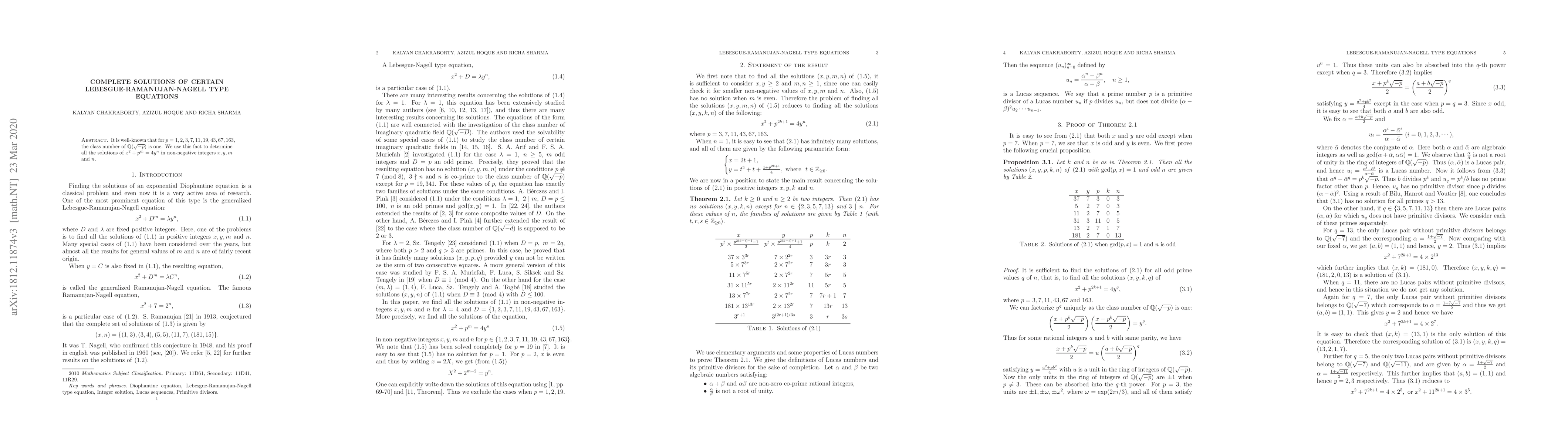 This paper solves certain Lebesgue-Ramanujan-Nagell equations by leveraging known class number properties for quadratic fields, providing solutions for non-negative integers x, y, m, and n.