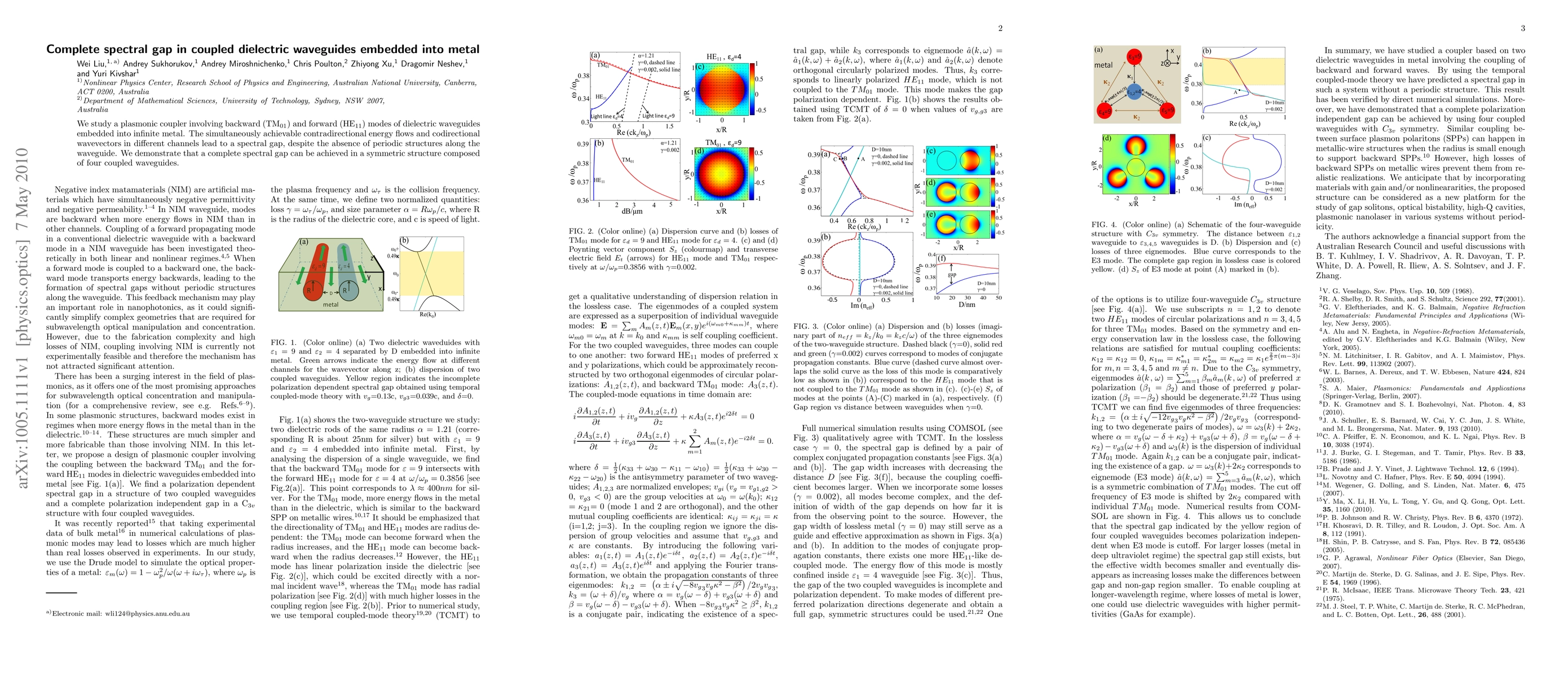 This paper investigates a plasmonic coupler with dielectric waveguides embedded in metal, showing that a complete spectral gap can be achieved through contradirectional energy flows and codirectional wavevectors in coupled waveguides, even without periodic structures, and demonstrates this in a symmetric four-waveguide configuration.