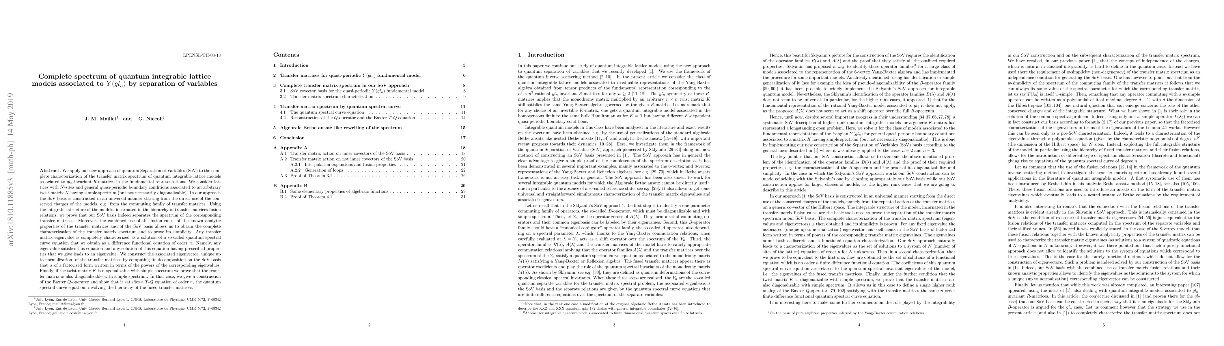 We apply our new approach of quantum Separation of Variables (SoV) to the complete characterization of the transfer matrix spectrum of quantum integrable lattice models associated to gl(n)-invariant R-matrices in the fundamental representations. We consider lattices with N sites and quasi-periodic boundary conditions associated to an arbitrary twist K having simple spectrum (but not necessarily diagonalizable). In our approach the SoV basis is constructed in an universal manner starting from the direct use of the conserved charges of the models, i.e., from the commuting family of transfer matrices. Using the integrable structure of the models, incarnated in the hierarchy of transfer matrices fusion relations, we prove that our SoV basis indeed separates the spectrum of the corresponding transfer matrices. Moreover, the combined use of the fusion rules, of the known analytic properties of the transfer matrices and of the SoV basis allows us to obtain the complete characterization of the transfer matrix spectrum and to prove its simplicity. Any transfer matrix eigenvalue is completely characterized as a solution of a so-called quantum spectral curve equation that we obtain as a difference functional equation of order n. Namely, any eigenvalue satisfies this equation and any solution of this equation having prescribed properties leads to an eigenvalue. We construct the associated eigenvector, unique up to normalization, by computing its decomposition on the SoV basis that is of a factorized form written in terms of the powers of the corresponding eigenvalues. If the twist matrix K is diagonalizable with simple spectrum then the transfer matrix is also diagonalizable with simple spectrum. In that case, we give a construction of the Baxter Q-operator satisfying a T-Q equation of order n, the quantum spectral curve equation, involving the hierarchy of the fused transfer matrices.