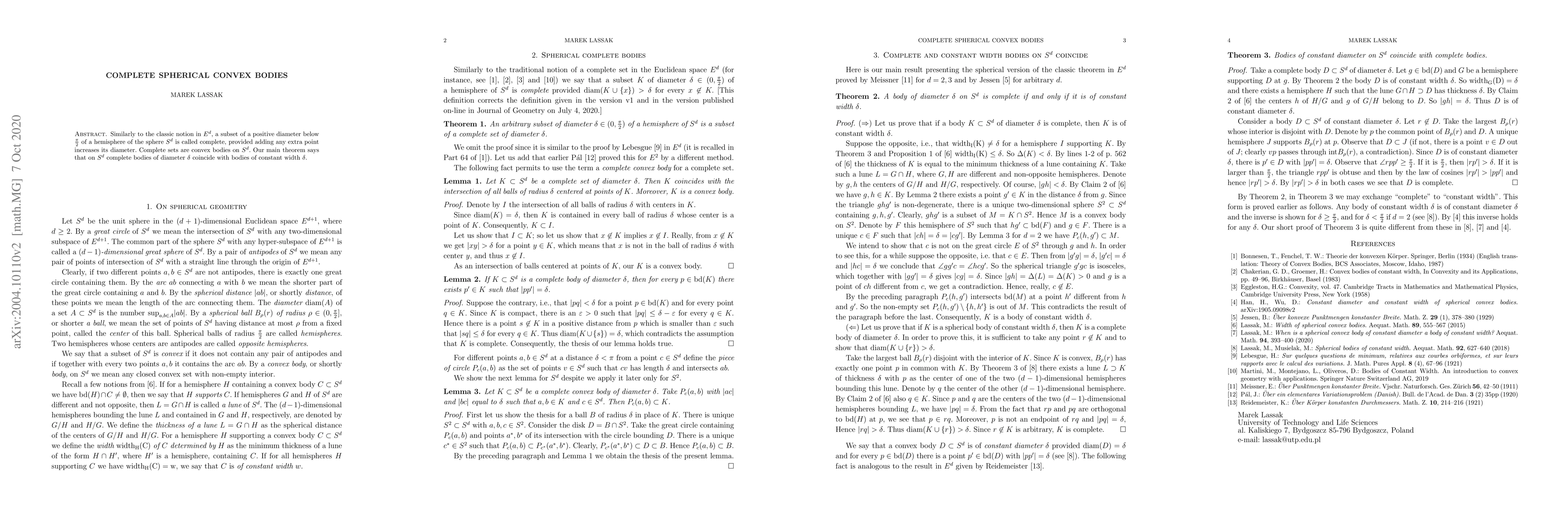 Summary: The paper defines complete spherical convex bodies on $S^d$ as subsets of a hemisphere with a diameter below $\frac{\pi}{2}$ whose diameter increases with any additional point. The main theorem establishes that complete spherical convex bodies of diameter $\delta$ are equivalent to those of constant width $\delta$.