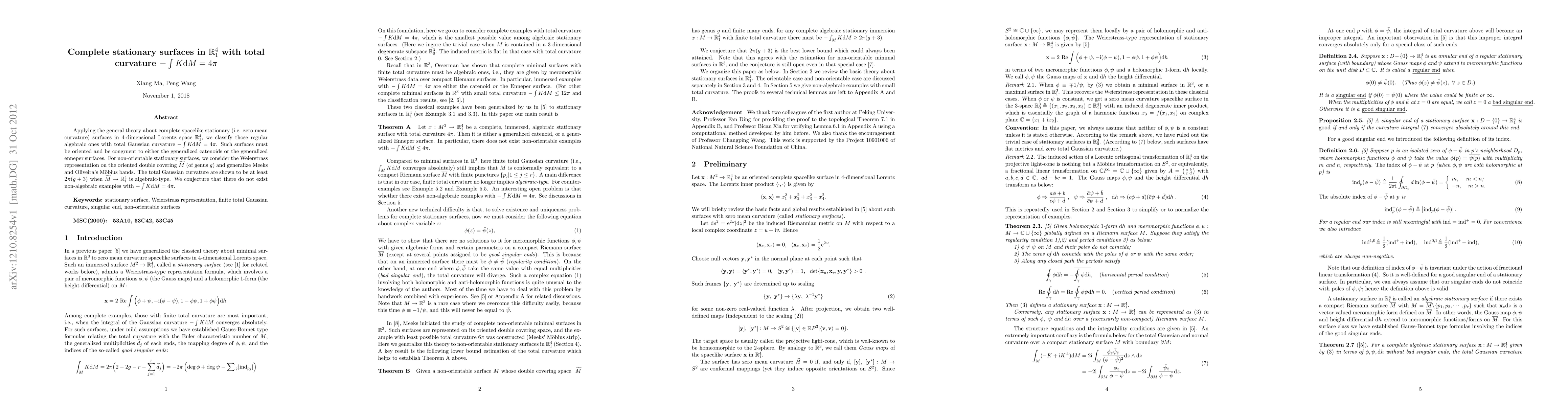 This paper classifies complete stationary surfaces in 4-dimensional Lorentz space $\mathbb{R}^4_1$ with total Gaussian curvature $-\int K\mathrm{d}M=4\pi$, showing that they are congruent to generalized catenoids or enneper surfaces. It also explores non-orientable surfaces and conjectures that no non-algebraic examples exist with the specified curvature.