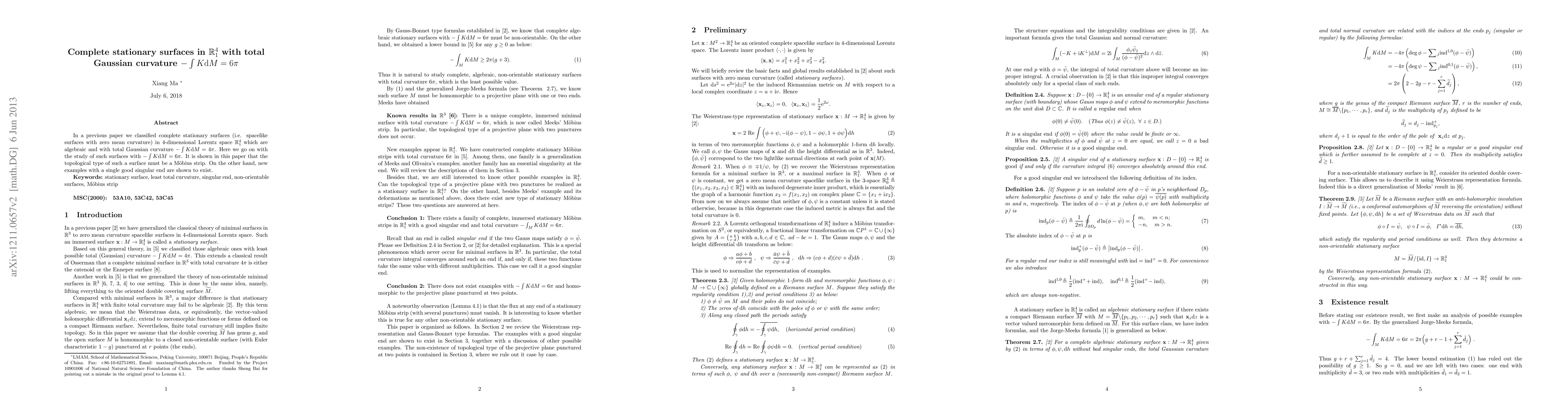 Researchers found that complete stationary surfaces in 4-dimensional Lorentz space with total Gaussian curvature 6π must be a M"obius strip, but also discovered new examples with a single good singular end.