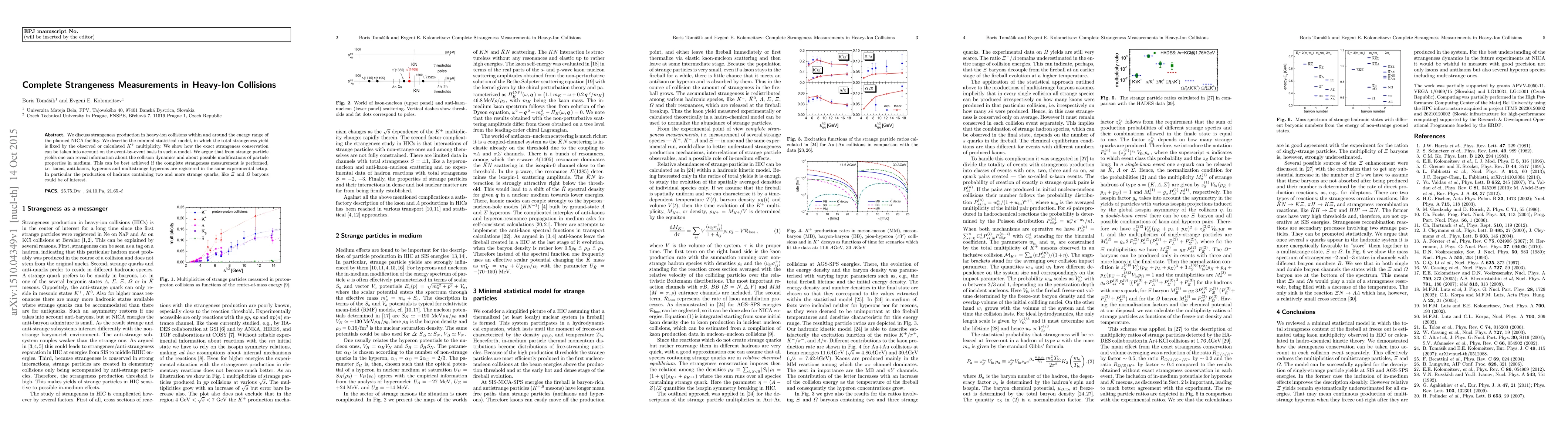 We discuss strangeness production in heavy-ion collisions within and around the energy range of the planned NICA facility. We describe the minimal statistical model, in which the total strangeness yield is fixed by the observed or calculated $K^+$ multiplicity. We show how the exact strangeness conservation can be taken into account on the event-by-event basis in such a model. We argue that from strange particle yields one can reveal information about the collision dynamics and about possible modifications of particle properties in medium. This can be best achieved if the complete strangeness measurement is performed, i.e. kaons, anti-kaons, hyperons and multistrange hyperons are registered in the same experimental setup. In particular the production of hadrons containing two and more strange quarks, like $\Xi$ and $\Omega$ baryons could be of interest.