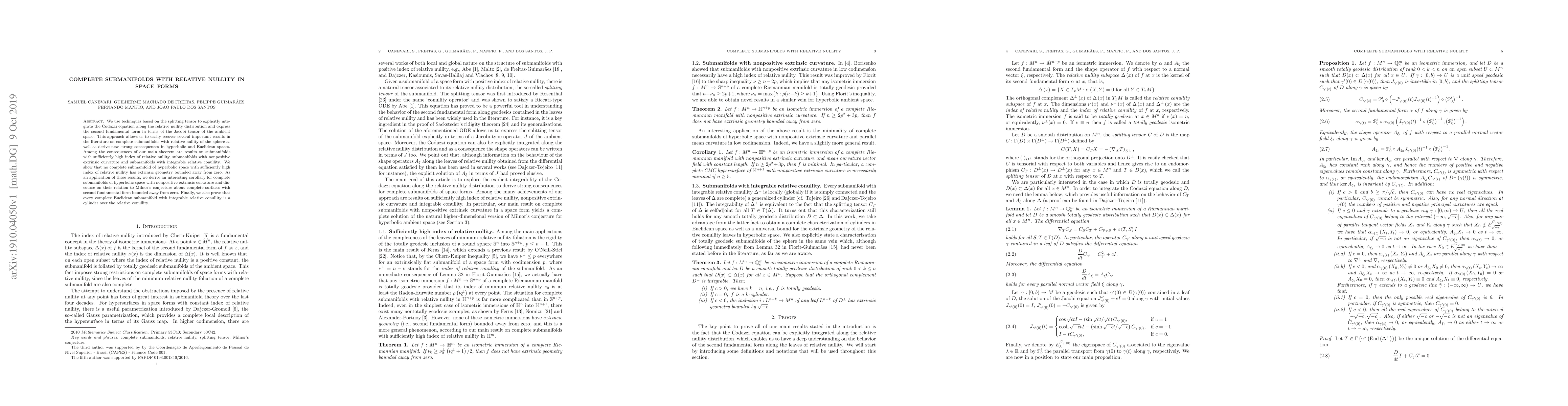This paper integrates the Codazzi equation using the splitting tensor to describe the second fundamental form in terms of the Jacobi tensor, yielding new results on complete submanifolds with relative nullity in space forms, including those with high index, nonpositive extrinsic curvature, and integrable relative conullity, particularly in hyperbolic and Euclidean spaces.