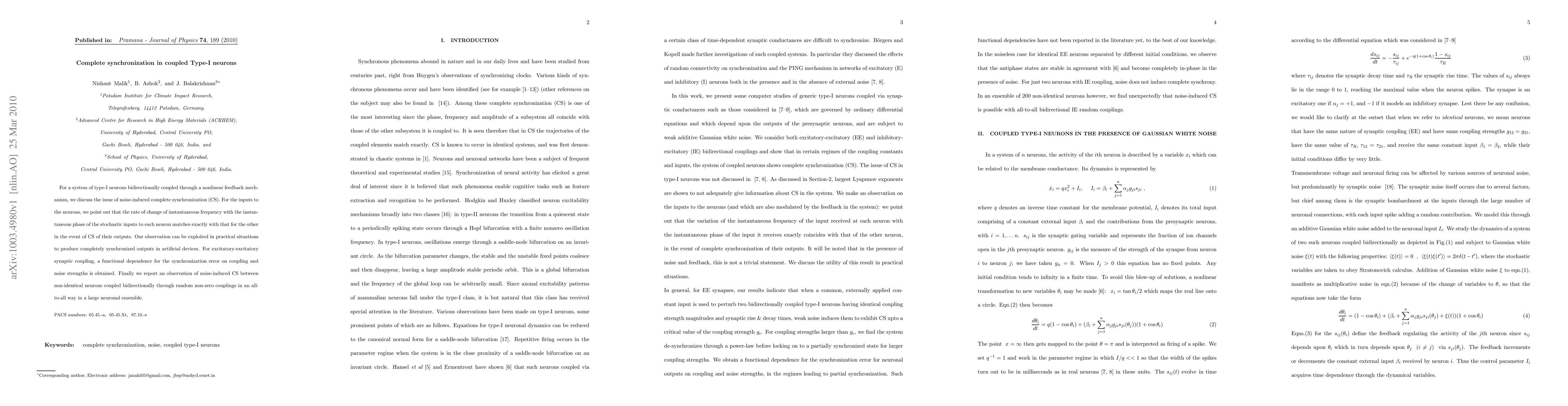 For a system of type-I neurons bidirectionally coupled through a nonlinear feedback mechanism, we discuss the issue of noise-induced complete synchronization (CS). For the inputs to the neurons, we point out that the rate of change of instantaneous frequency with the instantaneous phase of the stochastic inputs to each neuron matches exactly with that for the other in the event of CS of their outputs. Our observation can be exploited in practical situations to produce completely synchronized outputs in artificial devices. For excitatory-excitatory synaptic coupling, a functional dependence for the synchronization error on coupling and noise strengths is obtained. Finally we report an observation of noise-induced CS between non-identical neurons coupled bidirectionally through random non-zero couplings in an all-to- all way in a large neuronal ensemble.