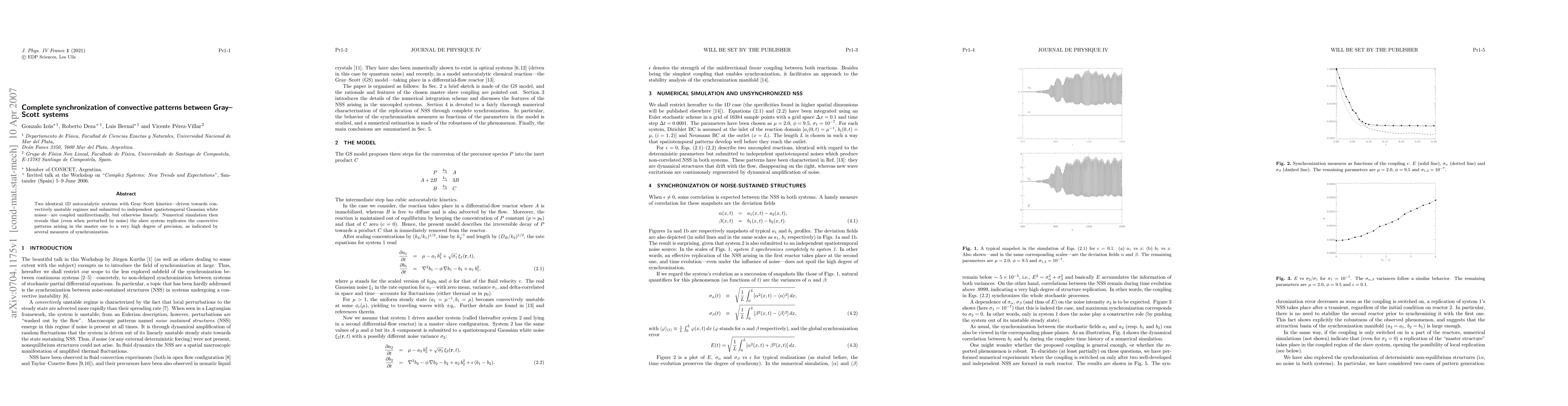 This research demonstrates complete synchronization of convective patterns between two 1D Gray-Scott systems, showing that the slave system accurately replicates the master's patterns despite being subjected to independent noise, as evidenced by various synchronization measures.