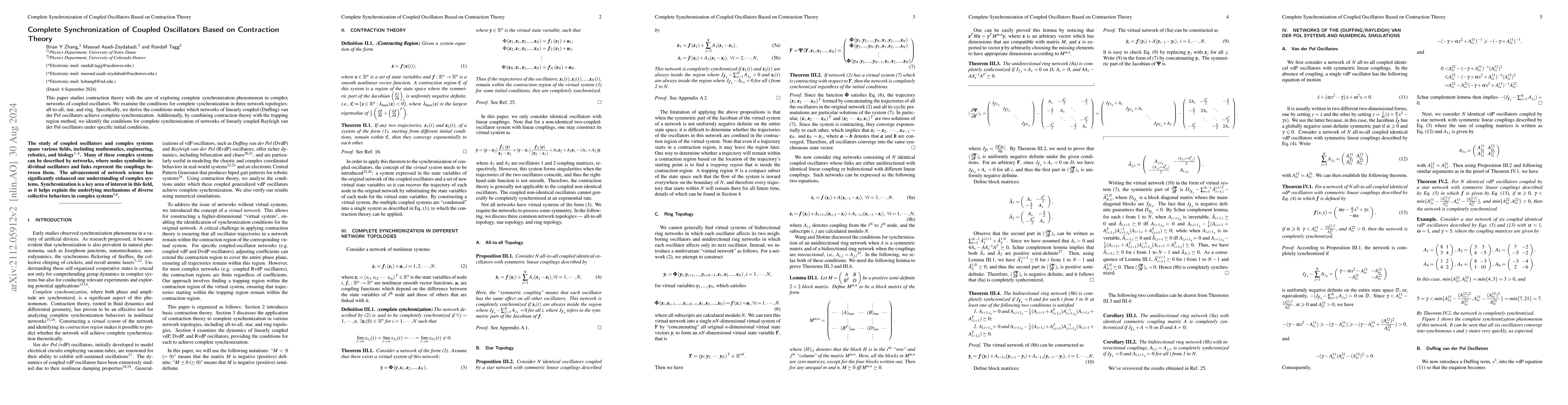 The paper introduces the application of contraction theory to the synchronization problem of coupled oscillator networks, providing detailed conditions for complete synchronization in various topologies.