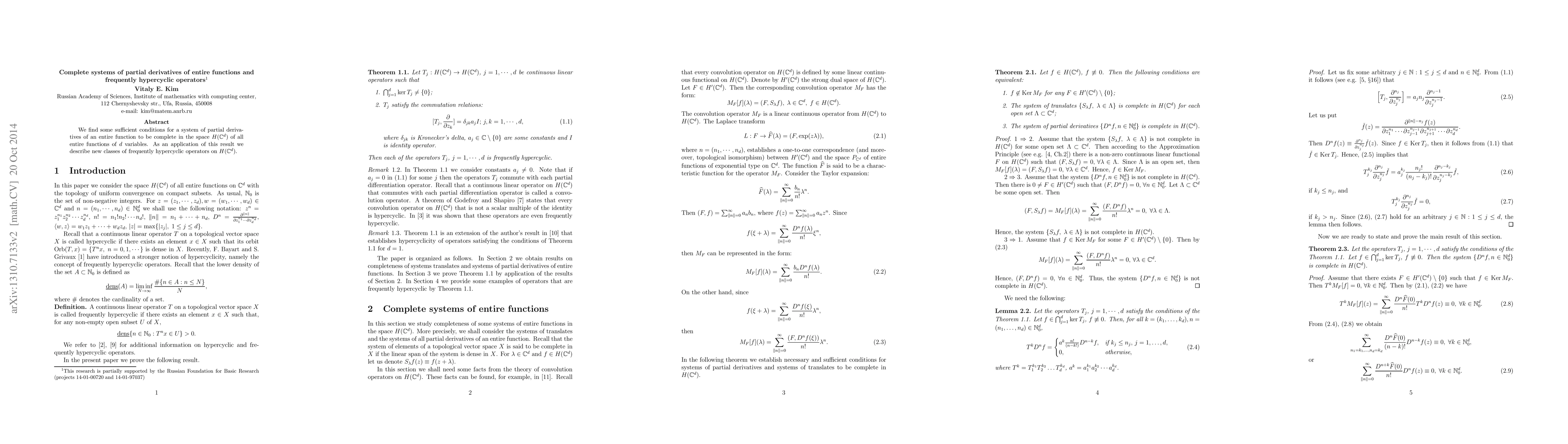Summary: The paper establishes conditions for a system of partial derivatives of entire functions to be complete in the space of multivariable entire functions, and uses this to identify new classes of frequently hypercyclic operators.