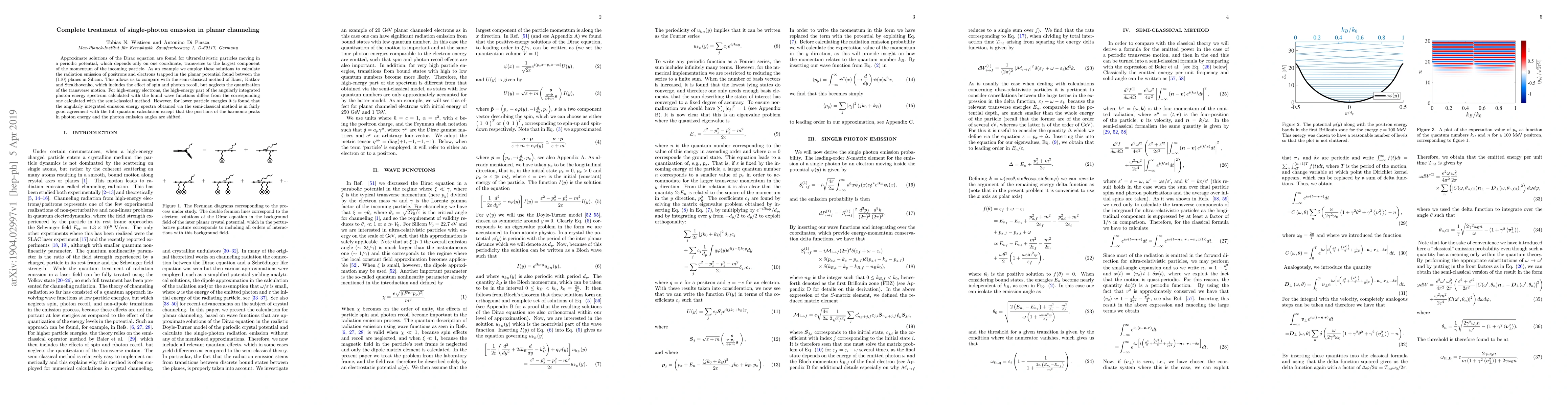Approximate solutions of the Dirac equation are found for ultrarelativistic particles moving in a periodic potential, which depends only on one coordinate, transverse to the largest component of the momentum of the incoming particle. As an example we employ these solutions to calculate the radiation emission of positrons and electrons trapped in the planar potential found between the (110) planes in Silicon. This allows us to compare with the semi-classical method of Baier, Katkov and Strakhovenko, which includes the effect of spin and photon recoil, but neglects the quantization of the transverse motion. For high-energy electrons, the high-energy part of the angularly integrated photon energy spectrum calculated with the found wave functions differs from the corresponding one calculated with the semi-classical method. However, for lower particle energies it is found that the angularly integrated emission energy spectra obtained via the semi-classical method is in fairly good agreement with the full quantum calculation except that the positions of the harmonic peaks in photon energy and the photon emission angles are shifted.