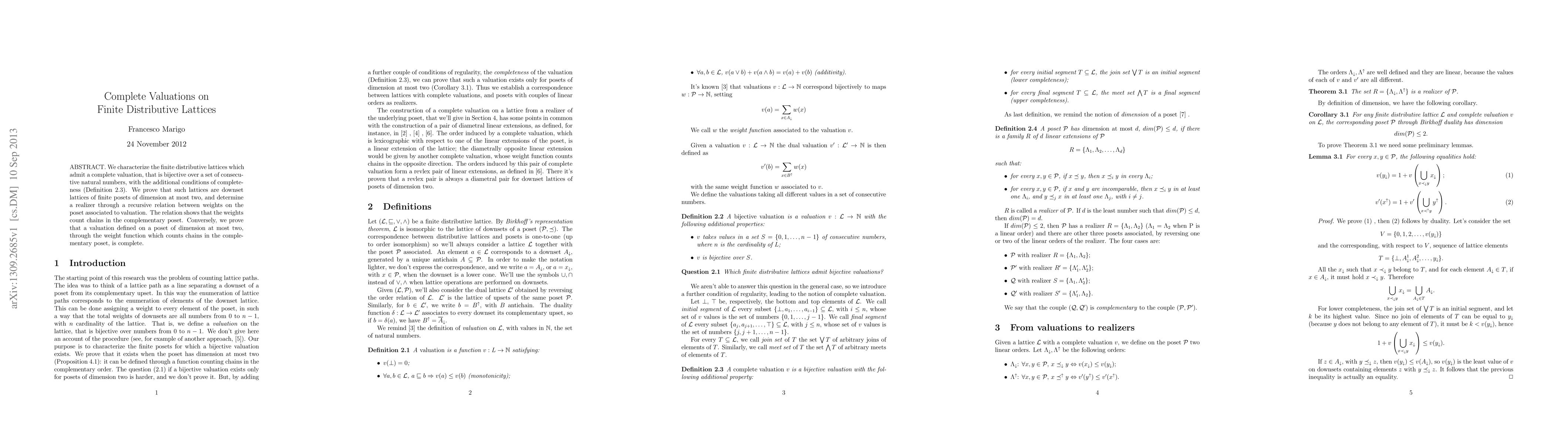 We characterize the finite distributive lattices which admit a complete valuation, that is bijective over a set of consecutive natural numbers, with the additional conditions of completeness (Definition 2.3). We prove that such lattices are downset lattices of finite posets of dimension at most two, and determine a realizer through a recursive relation between weights on the poset associated to valuation. The relation shows that the weights count chains in the complementary poset. Conversely, we prove that a valuation defined on a poset of dimension at most two, through the weight function which counts chains in the complementary poset, is complete.