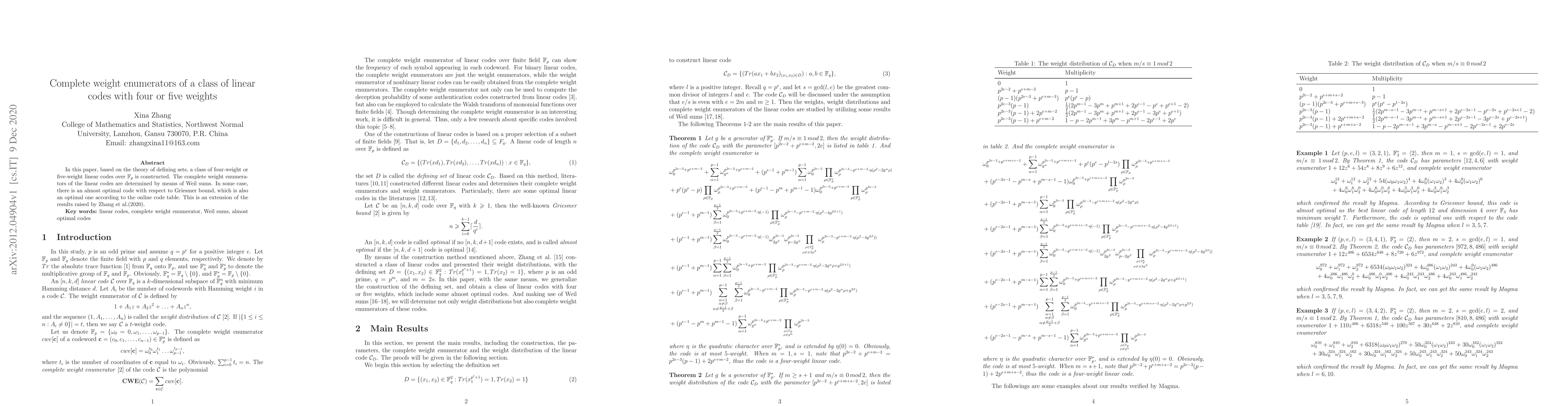 This paper constructs a class of four-weight or five-weight linear codes over Fp using defining sets and determines their complete weight enumerators via Weil sums. An almost optimal code with respect to the Griesmer bound is found, which also matches optimal values according to an online code table, extending previous results by Zhang et al. (2020).
