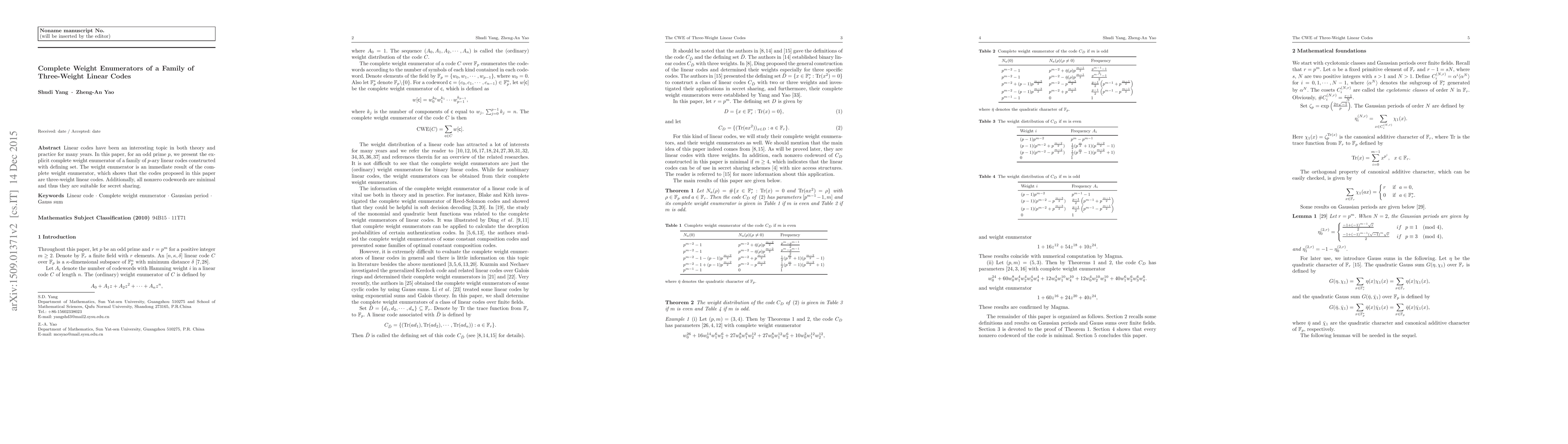 This paper presents the complete weight enumerator for a family of three-weight $p$-ary linear codes constructed using a defining set. The codes are shown to be minimal and suitable for secret sharing applications.