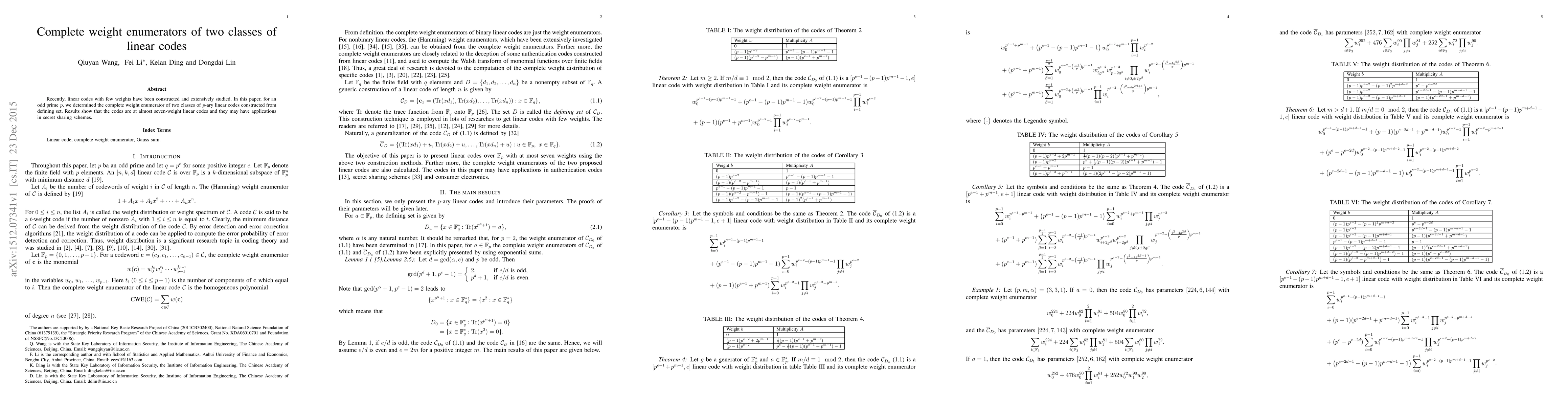 This paper determines the complete weight enumerator for two classes of p-ary linear codes derived from defining sets, revealing they are nearly seven-weight codes, potentially useful in secret sharing schemes.