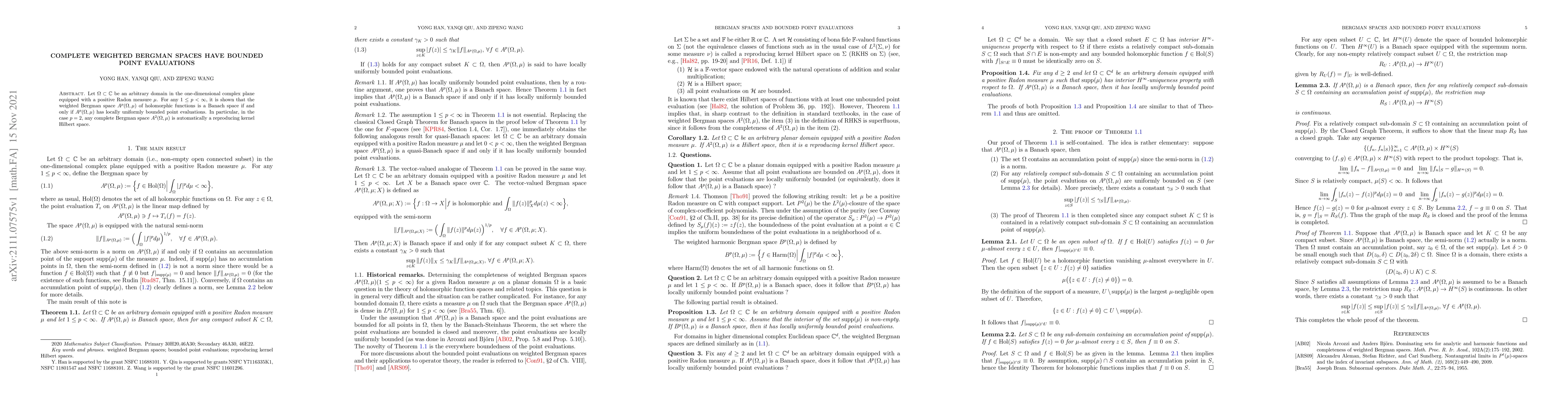 Let $\Omega\subset \mathbb{C}$ be an arbitrary domain in the one-dimensional complex plane equipped with a positive Radon measure $\mu$. For any $1\le p< \infty$, it is shown that the weighted Bergman space $A^p(\Omega, \mu)$ of holomorphic functions is a Banach space if and only if $A^p(\Omega, \mu)$ has locally uniformly bounded point evaluations. In particular, in the case $p =2$, any complete Bergman space $A^2(\Omega, \mu)$ is automatically a reproducing kernel Hilbert space.