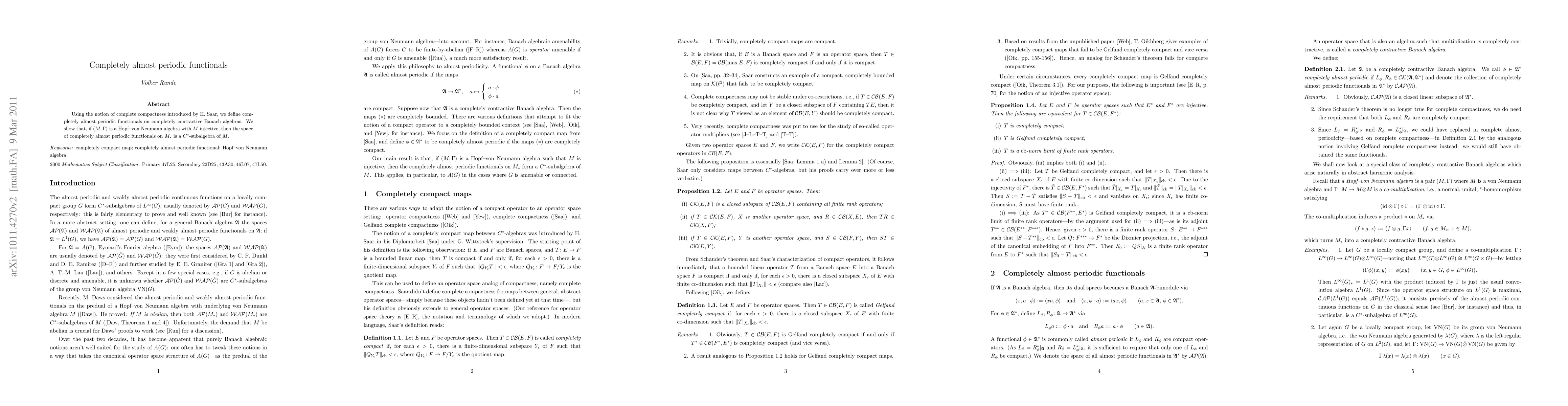 Using the notion of complete compactness introduced by H. Saar, we define completely almost periodic functionals on completely contractive Banach algebras. We show that, if $(M,\Gamma)$ is a Hopf--von Neumann algebra with $M$ injective, then the space of completely almost periodic functionals on $M_\ast$ is a $C^\ast$-subalgebra of $M$.