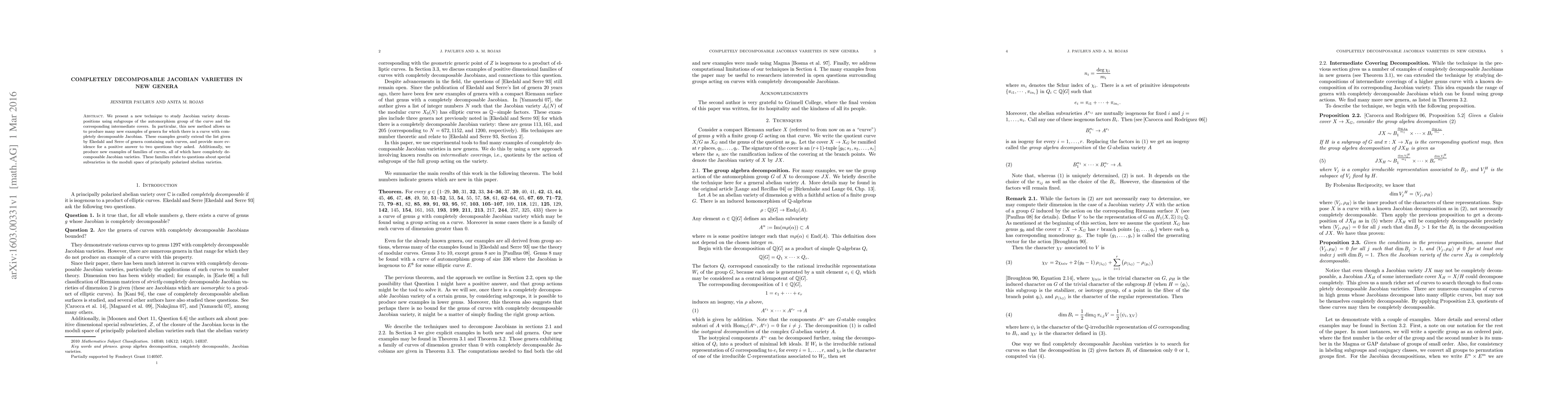 We present a new technique to study Jacobian variety decompositions using subgroups of the automorphism group of the curve and the corresponding intermediate covers. In particular, this new method allows us to produce many new examples of genera for which there is a curve with completely decomposable Jacobian. These examples greatly extend the list given by Ekedahl and Serre of genera containing such curves, and provide more evidence for a positive answer to two questions they asked. Additionally, we produce new examples of families of curves, all of which have completely decomposable Jacobian varieties. These families relate to questions about special subvarieties in the moduli space of principally polarized abelian varieties.
