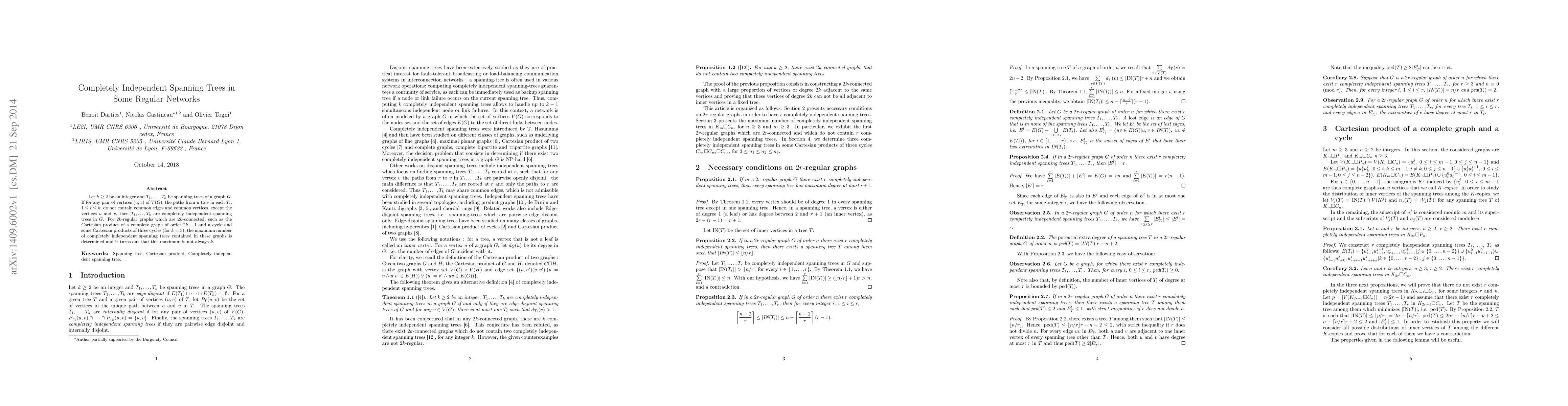 Let $k\ge 2$ be an integer and $T_1,\ldots, T_k$ be spanning trees of a graph $G$. If for any pair of vertices $(u,v)$ of $V(G)$, the paths from $u$ to $v$ in each $T_i$, $1\le i\le k$, do not contain common edges and common vertices, except the vertices $u$ and $v$, then $T_1,\ldots, T_k$ are completely independent spanning trees in $G$. For $2k$-regular graphs which are $2k$-connected, such as the Cartesian product of a complete graph of order $2k-1$ and a cycle and some Cartesian products of three cycles (for $k=3$), the maximum number of completely independent spanning trees contained in these graphs is determined and it turns out that this maximum is not always $k$.