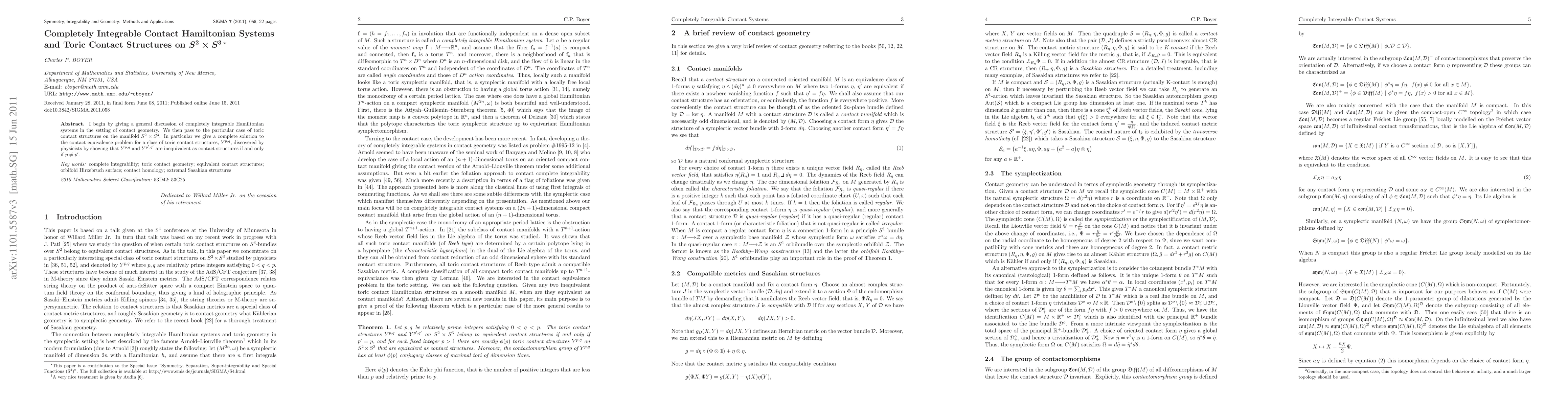 I begin by giving a general discussion of completely integrable Hamiltonian systems in the setting of contact geometry. We then pass to the particular case of toric contact structures on the manifold $S^2\times S^3$. In particular we give a complete solution to the contact equivalence problem for a class of toric contact structures, $Y^{p,q}$, discovered by physicists by showing that $Y^{p,q}$ and $Y^{p',q'}$ are inequivalent as contact structures if and only if $p\neq p'$.