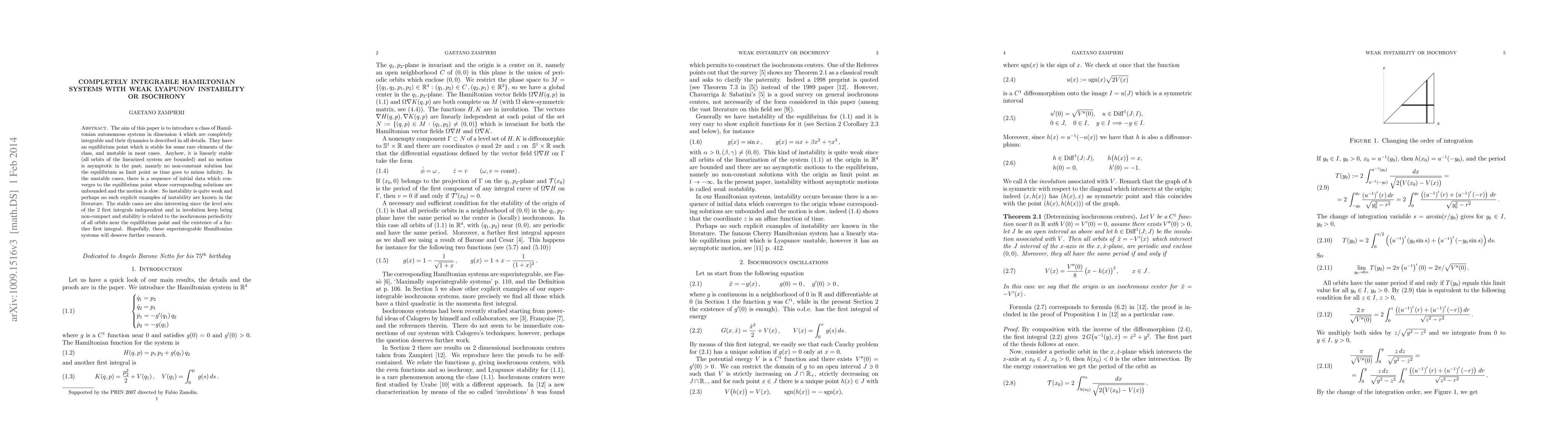 The aim of this paper is to introduce a class of Hamiltonian autonomous systems in dimension 4 which are completely integrable and their dynamics is described in all details. They have an equilibrium point which is stable for some rare elements of the class, and unstable in most cases. Anyhow, it is linearly stable (all orbits of the linearized system are bounded) and no motion is asymptotic in the past, namely no non-constant solution has the equilibrium as limit point as time goes to minus infinity. In the unstable cases, there is a sequence of initial data which converges to the equilibrium point whose corresponding solutions are unbounded and the motion is slow. So instability is quite weak and perhaps no such explicit examples of instability are known in the literature. The stable cases are also interesting since the level sets of the 2 first integrals independent and in involution keep being non-compact and stability is related to the isochronous periodicity of all orbits near the equilibrium point and the existence of a further first integral. Hopefully, these superintegrable Hamiltonian systems will deserve further research.
