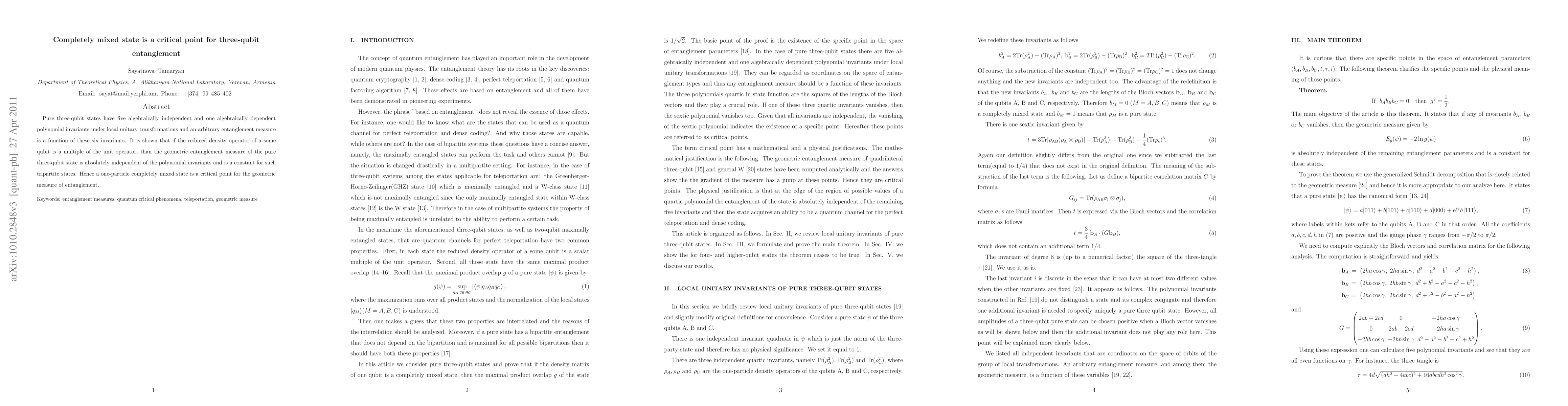 This paper demonstrates that a one-particle completely mixed state in a three-qubit system acts as a critical point for geometric entanglement measures, where the entanglement measure becomes constant regardless of the polynomial invariants. This highlights the unique role of a completely mixed state in tripartite entanglement.