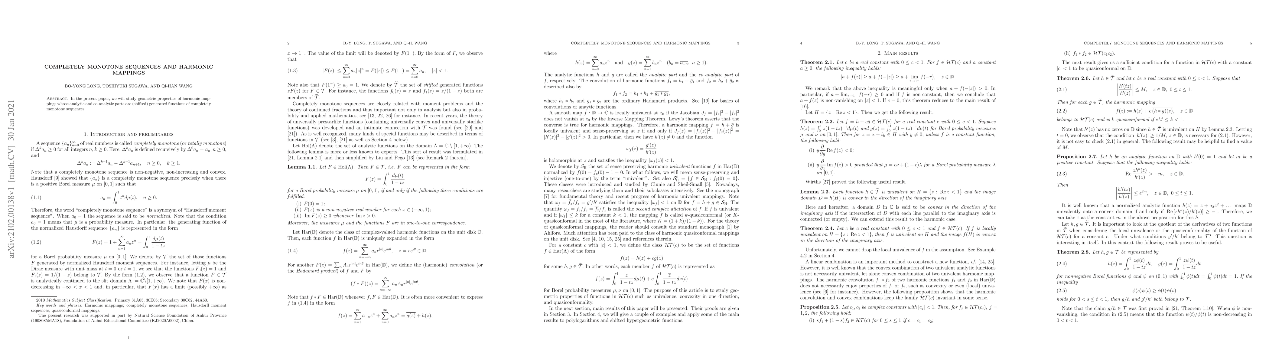 Summary: This paper investigates the geometric properties of harmonic mappings where the analytic and co-analytic parts are derived from shifted functions of completely monotone sequences. The focus is on understanding how these sequences influence the mappings' characteristics.