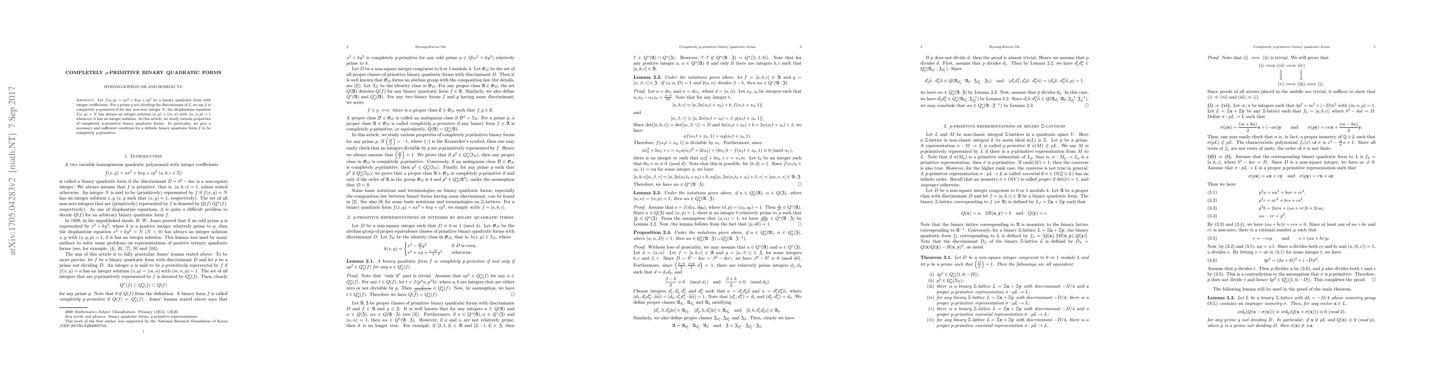 This paper investigates completely $p$-primitive binary quadratic forms, characterized by the existence of integer solutions $(x,y)$ to $f(x,y)=N$ with $(m,n,p)=1$ whenever such solutions exist, for a prime $p$ not dividing the discriminant of $f$. The study provides a necessary and sufficient condition for a definite binary quadratic form to exhibit this property.