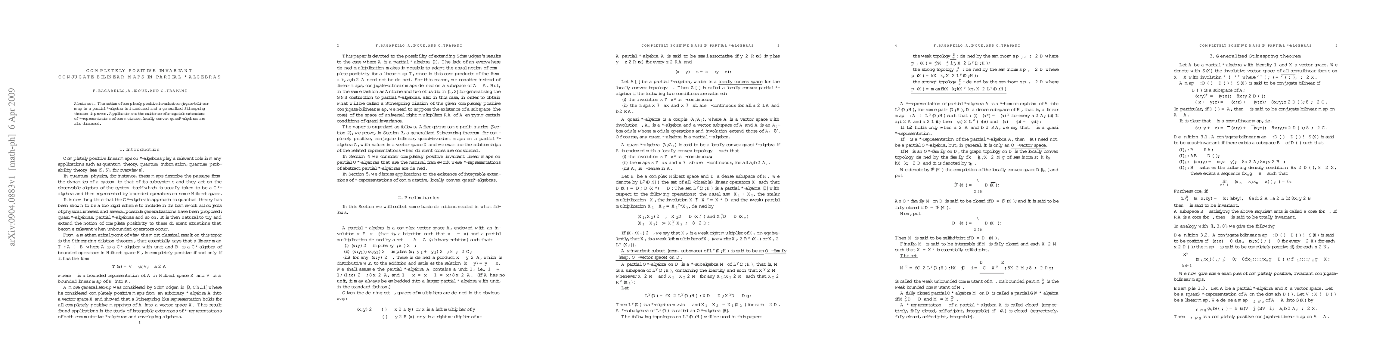The notion of completely positive invariant conjugate-bilinear map in a partial *-algebra is introduced and a generalized Stinespring theorem is proven. Applications to the existence of integrable extensions of *-representations of commutative, locally convex quasi*-algebras are also discussed.