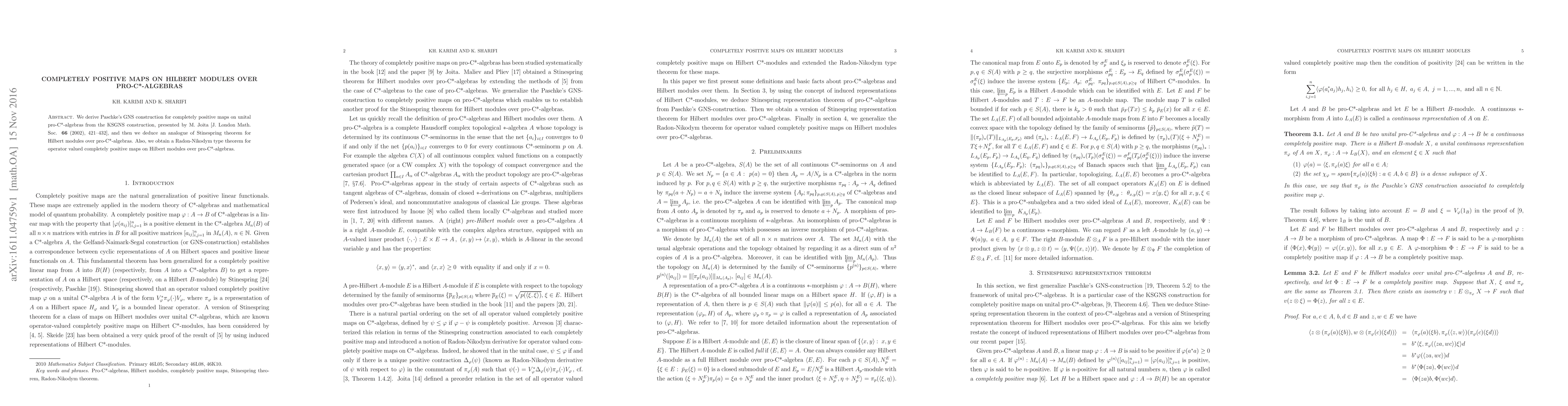 This paper derives Paschke's GNS construction for completely positive maps on unital pro-C*-algebras using M. Joita's KSGNS construction, and presents an analogue of Stinespring's dilation theorem for Hilbert modules over pro-C*-algebras, along with a Radon-Nikodym type theorem for operator-valued completely positive maps.
