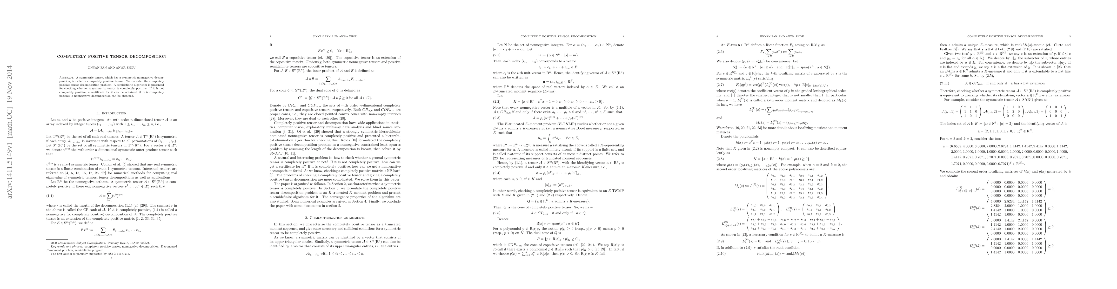 This paper explores the completely positive tensor decomposition problem, presenting a semidefinite algorithm to determine if a symmetric tensor has a nonnegative decomposition. If not, it provides a certificate of non-positivity; if it is completely positive, it yields a nonnegative decomposition.