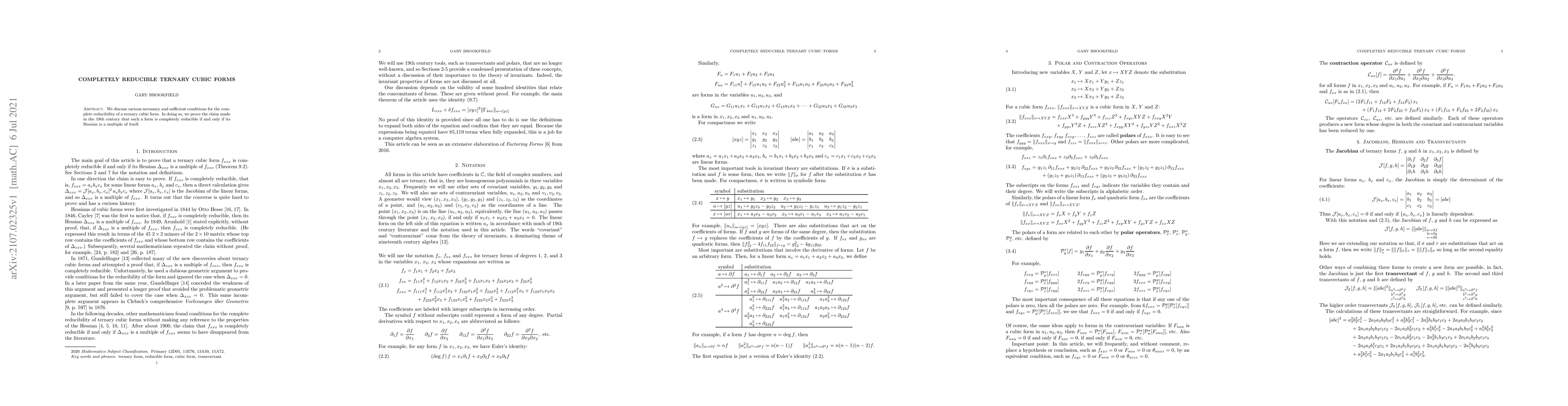 We discuss various necessary and sufficient conditions for the complete reducibility of a ternary cubic form. In doing so, we prove the claim made in the 19th century that such a form is completely reducible if and only if its Hessian is a multiple of itself.