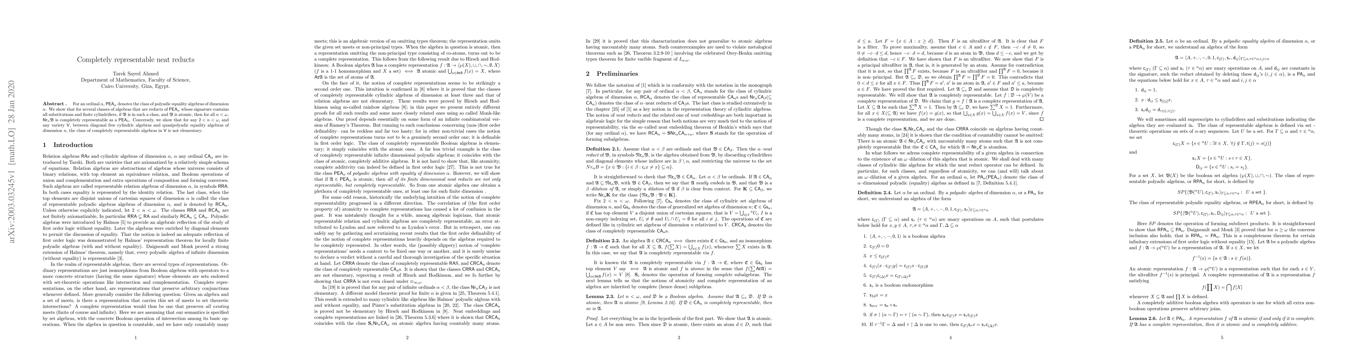 The paper shows that certain classes of reducts of the polyadic equality algebra of dimension ω are completely representable as specific algebras of lower dimensions, with implications for the study of cylindric algebras.