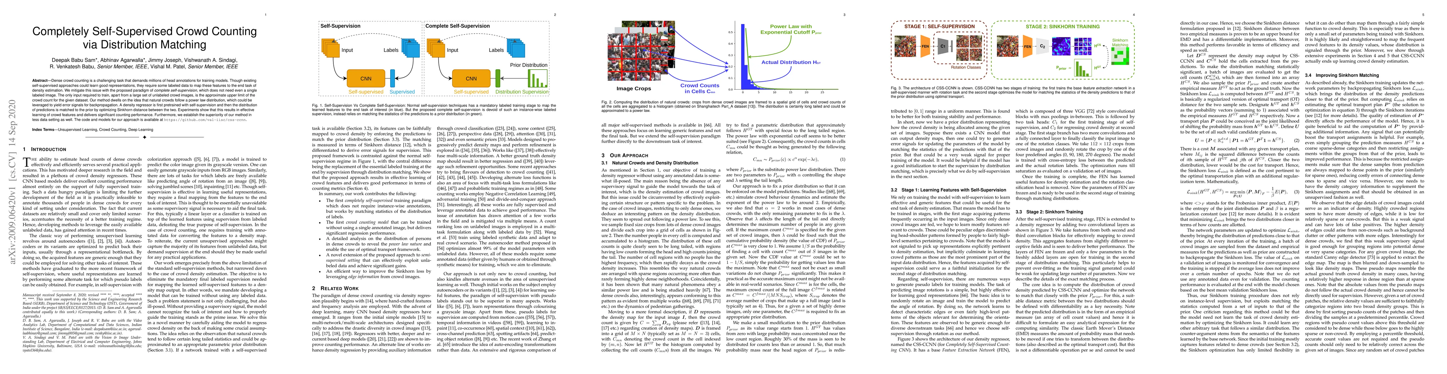 This paper proposes a completely self-supervised crowd counting method that does not require any labeled data, relying only on an approximate upper count limit and a large set of unlabeled images. It leverages the power law distribution of crowds to generate error signals, optimizing the Sinkhorn distance for distribution matching to achieve effective learning and superior counting performance, especially in low data settings.