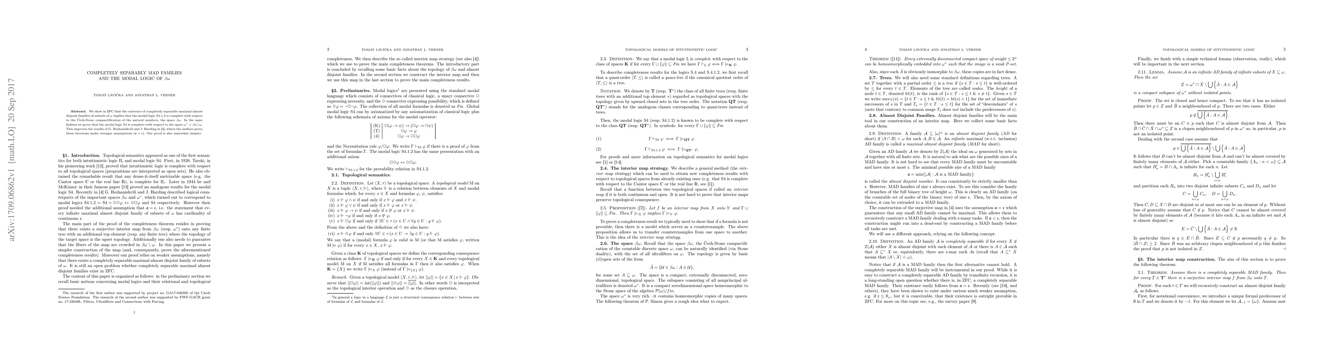 This paper demonstrates in ZFC that the existence of completely separable maximal almost disjoint families implies the completeness of modal logics S4.1.2 and S4 with respect to the spaces $\beta\omega$ and $\omega^*$, respectively, improving upon previous results that required stronger assumptions.
