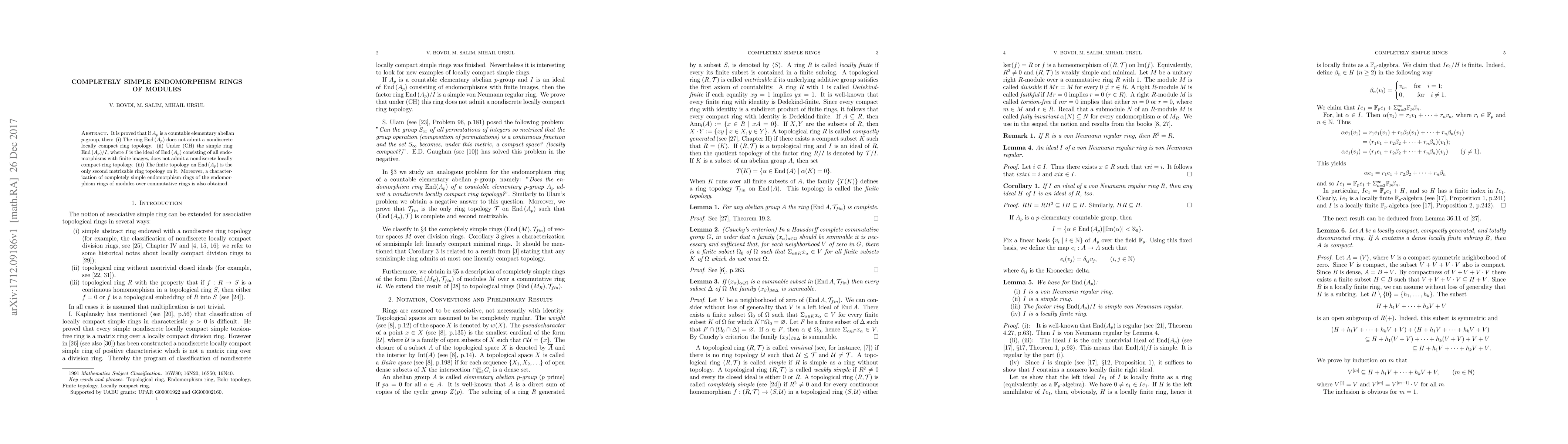 It is proved that if A_p is a countable elementary abelian p-group, then: (i) The ring End(A_p) does not admit a nondiscrete locally compact ring topology. (ii) Under (CH) the simple ring End(A_p)/I, where I is the ideal of End(A_p) consisting of all endomorphisms with finite images, does not admit a nondiscrete locally compact ring topology. (iii) The finite topology on End(A_p) is the only second metrizable ring topology on it. Moreover, a characterization of completely simple endomorphism rings of the endomorphism rings of modules over commutative rings is also obtained.
