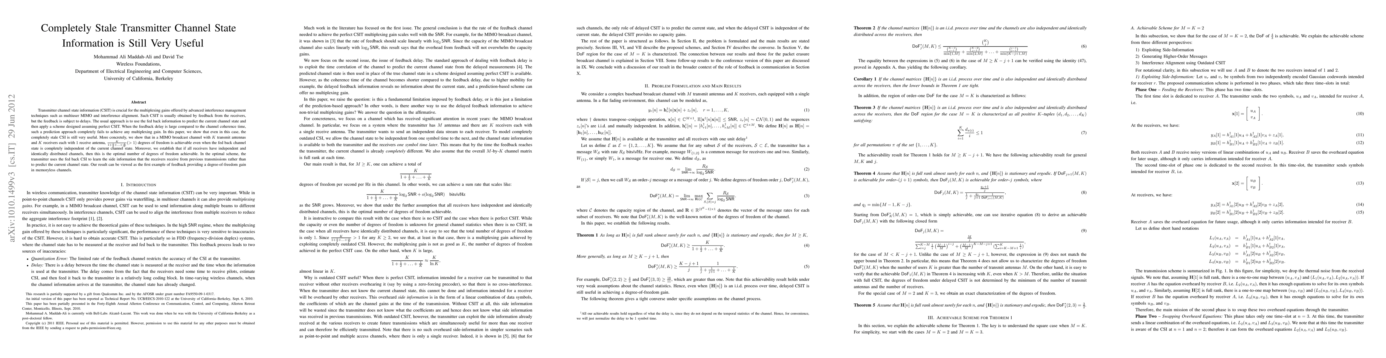 This paper demonstrates that even completely stale transmitter channel state information (CSIT) can provide significant benefits in advanced interference management, such as multiuser MIMO, despite large feedback delays. It shows that in a MIMO broadcast channel, the transmitter can achieve more than one degree of freedom using outdated CSIT to infer side information from previous transmissions, rather than predicting current channel states.