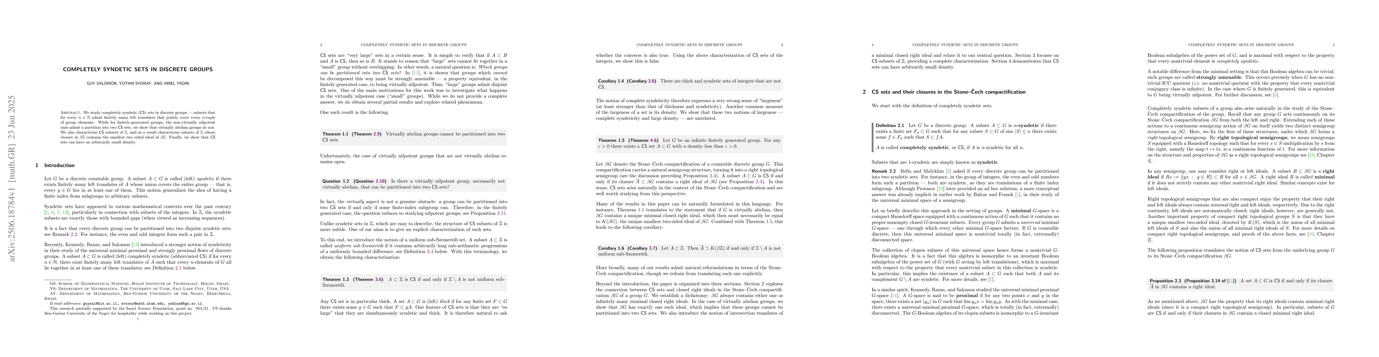 We study completely syndetic (CS) sets in discrete groups - subsets that for every natural n admit finitely many left translates that jointly cover every n-tuple of group elements. While for finitely-generated groups, the non-virtually nilpotent ones admit a partition into two CS sets, we show that virtually abelian groups do not. We also characterize CS subsets of the group of integers Z, and as a result characterize subsets of Z whose closure in the Stone-Cech compactification contains the smallest two sided ideal. Finally, we show that CS sets can have an arbitrarily small density.
