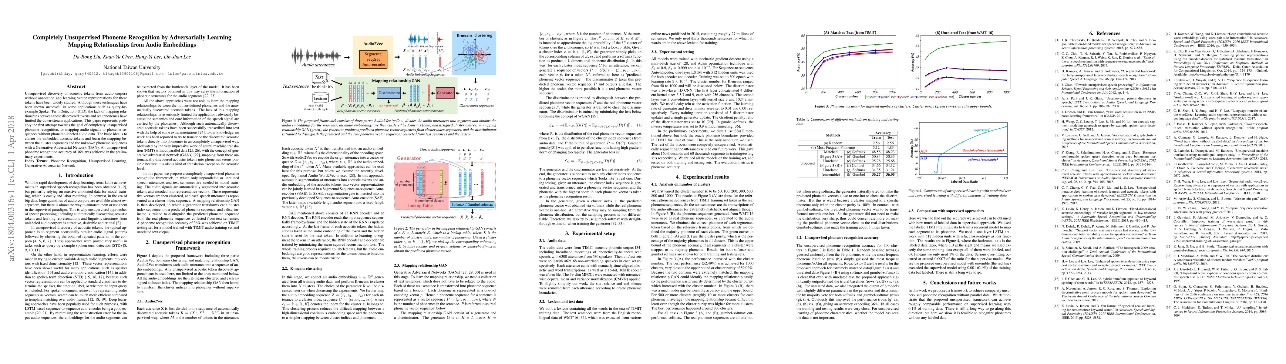 This paper proposes an unsupervised method for phoneme recognition using Generative Adversarial Networks (GANs) to map clustered acoustic tokens to unknown phoneme sequences without labeled data. Preliminary experiments achieved an accuracy of 36% in recognizing phoneme sequences.