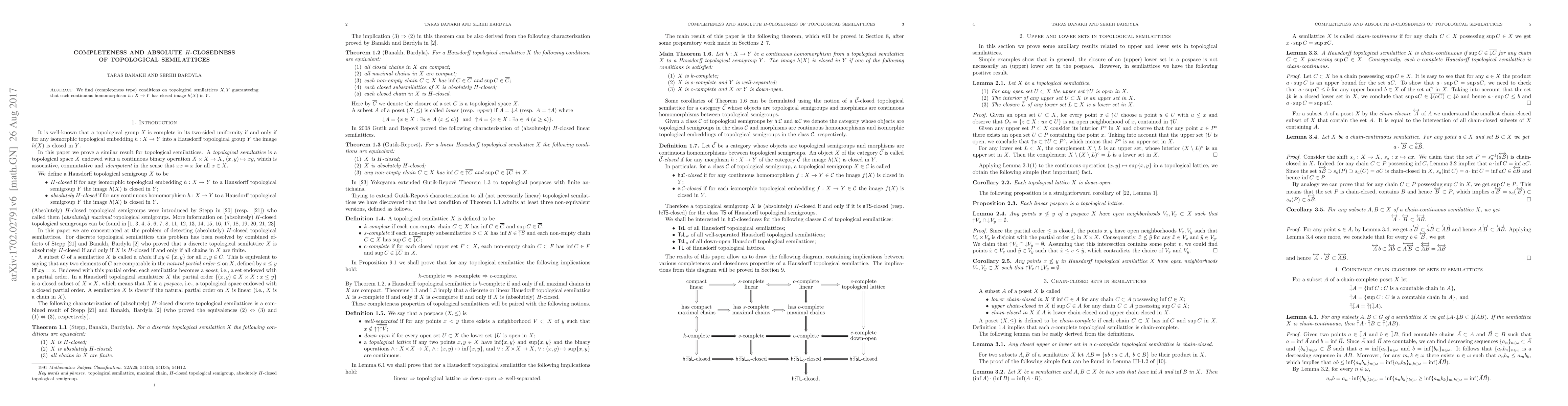 Summary: This paper investigates conditions under which topological semilattices $X$ and $Y$ ensure that every continuous homomorphism $h:X\to Y$ results in a closed image $h(X)$ in $Y$, focusing on completeness and absolute $H$-closedness properties.