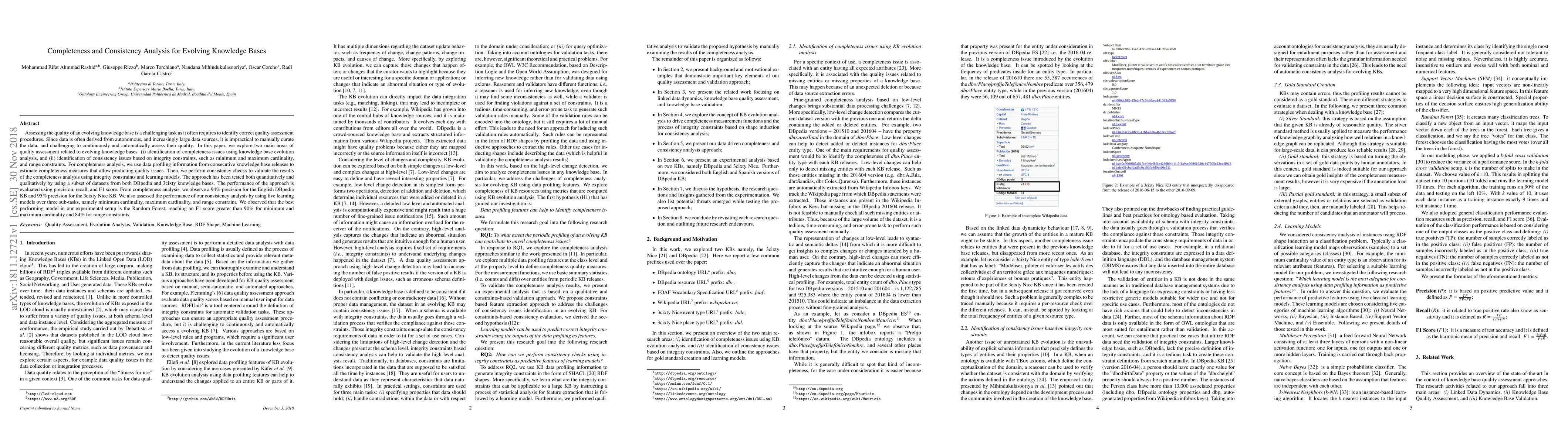 This paper investigates methods for assessing the completeness and consistency of evolving knowledge bases, employing data profiling and integrity constraints. The approach achieves high precision in completeness analysis and demonstrates strong performance in consistency checks, particularly with Random Forest models, achieving over 90% F1 score for cardinality constraints and 84% for range constraints.