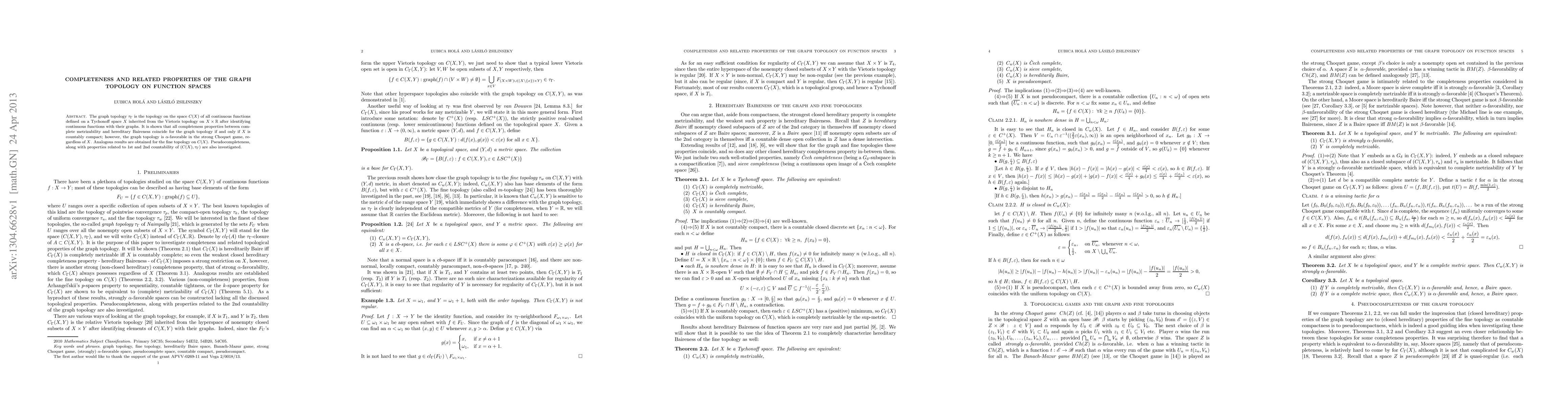 The graph topology $\tau_{\Gamma}$ is the topology on the space $C(X)$ of all continuous functions defined on a Tychonoff space $X$ inherited from the Vietoris topology on $X\times \mathbb R$ after identifying continuous functions with their graphs. It is shown that all completeness properties between complete metrizability and hereditary Baireness coincide for the graph topology if and only if $X$ is countably compact; however, the graph topology is $\alpha$-favorable in the strong Choquet game, regardless of $X$. Analogous results are obtained for the fine topology on $C(X)$. Pseudocompleteness, along with properties related to 1st and 2nd countability of $(C(X),\tau_{\Gamma})$ are also investigated.
