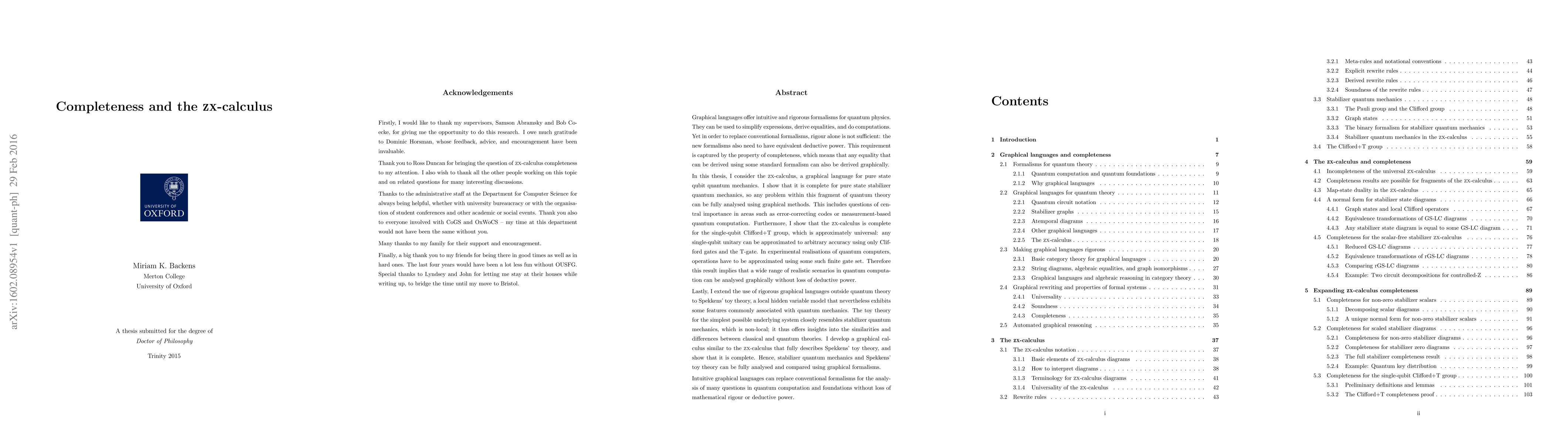 Graphical languages offer intuitive and rigorous formalisms for quantum physics. They can be used to simplify expressions, derive equalities, and do computations. Yet in order to replace conventional formalisms, rigour alone is not sufficient: the new formalisms also need to have equivalent deductive power. This requirement is captured by the property of completeness, which means that any equality that can be derived using some standard formalism can also be derived graphically. In this thesis, I consider the ZX-calculus, a graphical language for pure state qubit quantum mechanics. I show that it is complete for pure state stabilizer quantum mechanics, so any problem within this fragment of quantum theory can be fully analysed using graphical methods. This includes questions of central importance in areas such as error-correcting codes or measurement-based quantum computation. Furthermore, I show that the ZX-calculus is complete for the single-qubit Clifford+T group, which is approximately universal: any single-qubit unitary can be approximated to arbitrary accuracy using only Clifford gates and the T-gate. [...] Lastly, I extend the use of rigorous graphical languages outside quantum theory to Spekkens' toy theory, a local hidden variable model that nevertheless exhibits some features commonly associated with quantum mechanics. [...] I develop a graphical calculus similar to the ZX-calculus that fully describes Spekkens' toy theory, and show that it is complete. Hence, stabilizer quantum mechanics and Spekkens' toy theory can be fully analysed and compared using graphical formalisms. Intuitive graphical languages can replace conventional formalisms for the analysis of many questions in quantum computation and foundations without loss of mathematical rigour or deductive power.