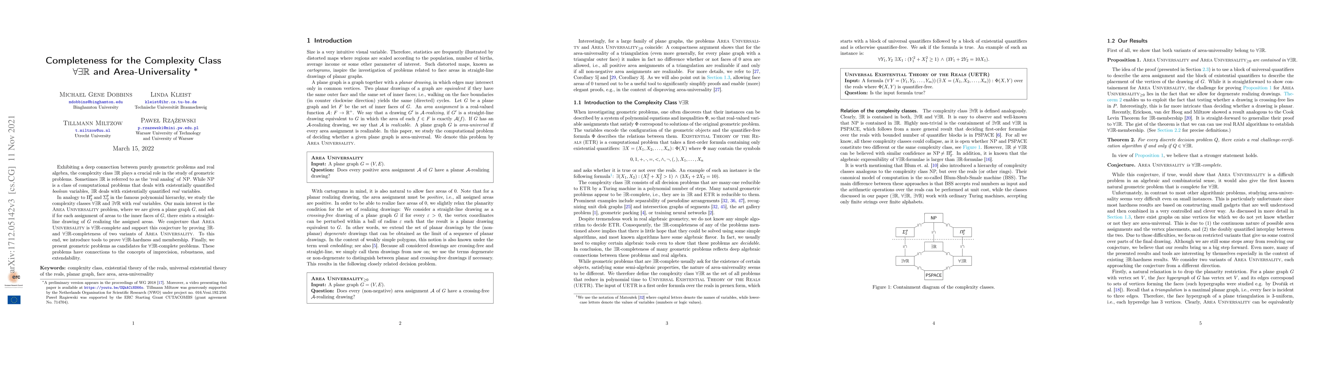 Research shows that a geometric problem called area-universality is likely to be ⚫ᾝ-complete for the complexity class π∗∗¼»™∧, which deals with real variables and has connections to imprecision, robustness, and extendability.