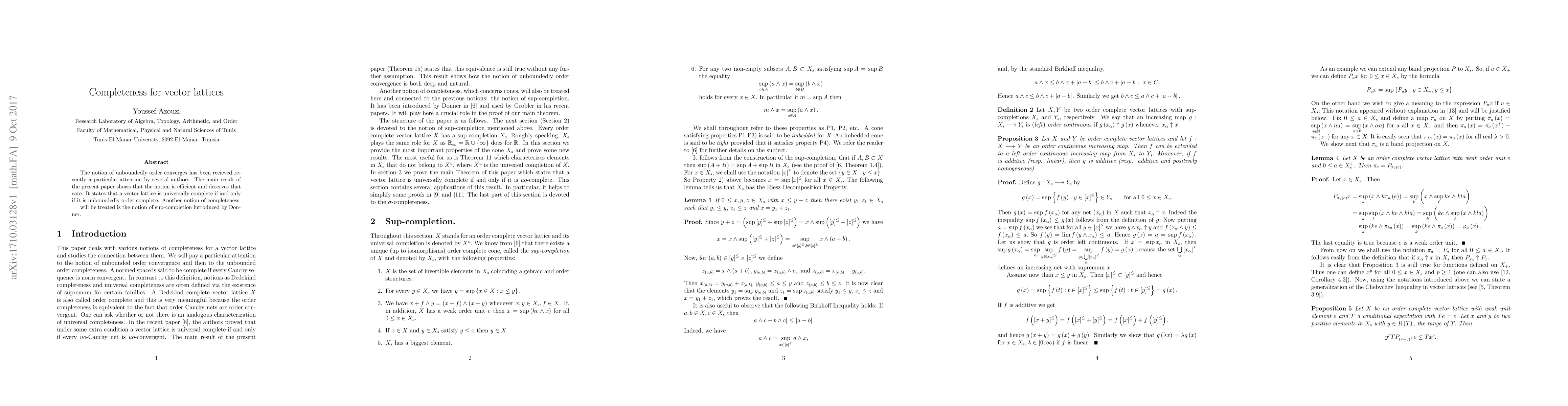 The notion of unboundedly order converges has been recieved recently a particular attention by several authors. The main result of the present paper shows that the notion is efficient and deserves that care. It states that a vector lattice is universally complete if and only if it is unboundedly order complete. Another notion of completeness will be treated is the notion of sup-completion introduced by Donner.
