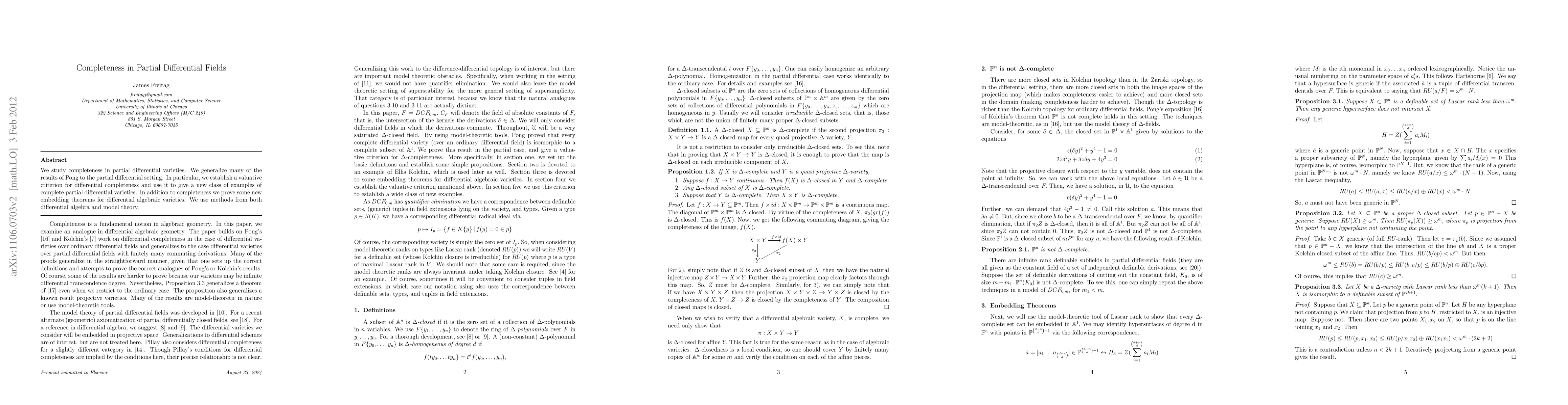 This paper generalizes results from ordinary differential fields to partial differential settings, establishing a valuative criterion for differential completeness and introducing a new class of complete partial differential varieties using differential algebra and model theory.