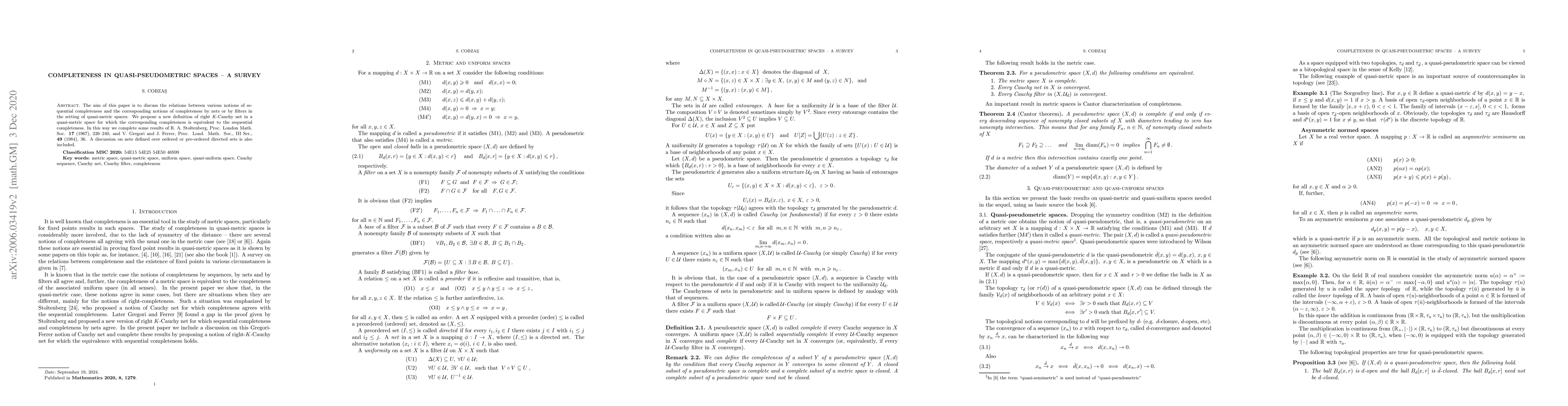 The aim of this paper is to discus the relations between various notions of sequential completeness and the corresponding notions of completeness by nets or by filters in the setting of quasi-metric spaces. We propose a new definition of right $K$-Cauchy net in a quasi-metric space for which the corresponding completeness is equivalent to the sequential completeness. In this way we complete some results of R.~A. Stoltenberg, Proc. London Math. Soc. \textbf{17} (1967), 226--240, and V.~Gregori and J.~Ferrer, Proc. Lond. Math. Soc., III Ser., \textbf{49} (1984), 36.