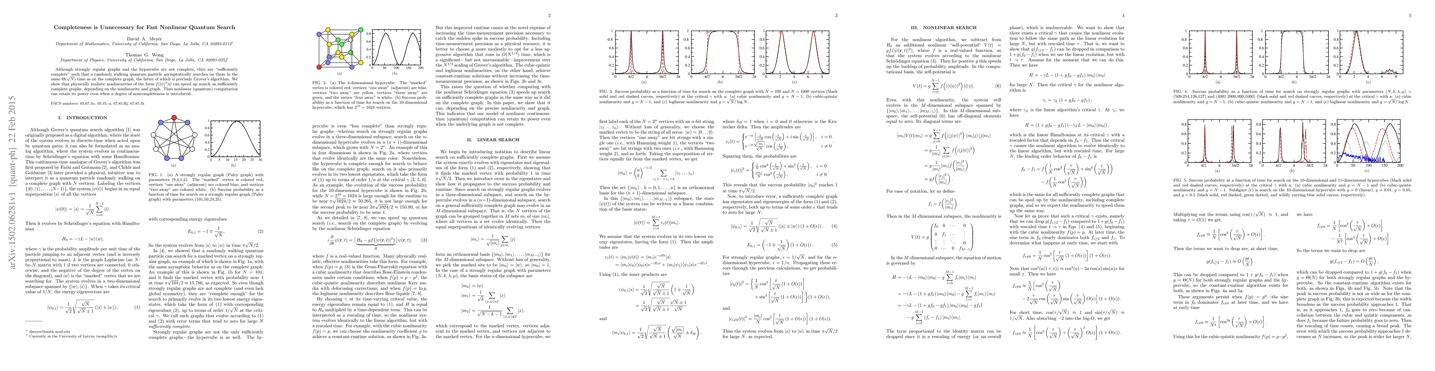 Although strongly regular graphs and the hypercube are not complete, they are "sufficiently complete" such that a randomly walking quantum particle asymptotically searches on them in the same $\Theta(\sqrt{N})$ time as on the complete graph, the latter of which is precisely Grover's algorithm. We show that physically realistic nonlinearities of the form $f(|\psi|^2)\psi$ can speed up search on sufficiently complete graphs, depending on the nonlinearity and graph. Thus nonlinear (quantum) computation can retain its power even when a degree of noncompleteness is introduced.