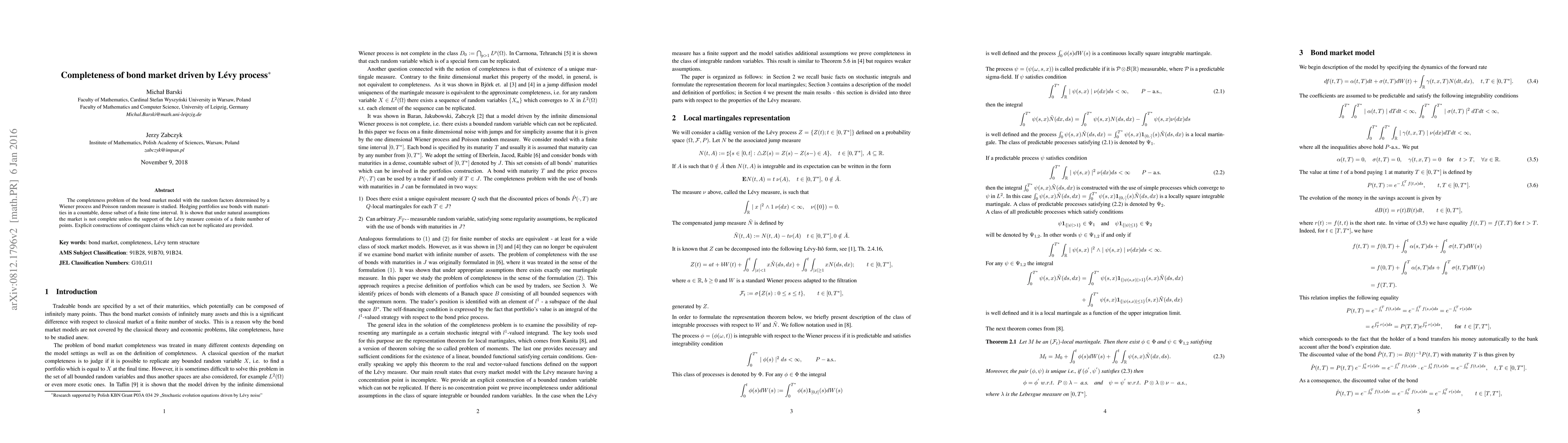 The completeness problem of the bond market model with the random factors determined by a Wiener process and Poisson random measure is studied. Hedging portfolios use bonds with maturities in a countable, dense subset of a finite time interval. It is shown that under natural assumptions the market is not complete unless the support of the L\'evy measure consists of a finite number of points. Explicit constructions of contingent claims which can not be replicated are provided.