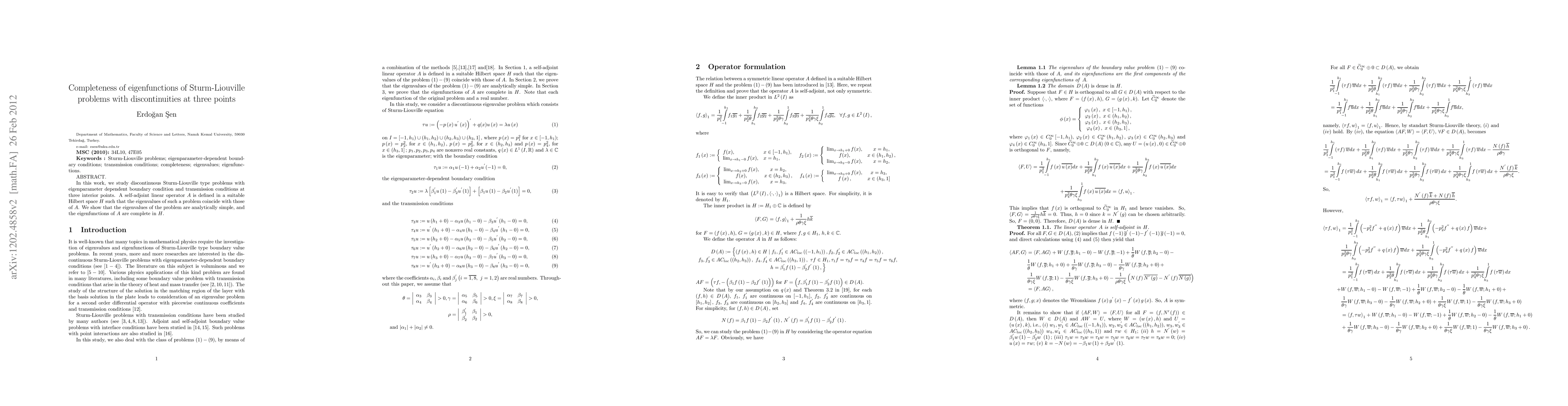 This paper investigates Sturm-Liouville problems featuring discontinuities at three points, establishing a self-adjoint linear operator whose eigenvalues match those of the problem. The study proves the analytic simplicity of eigenvalues and the completeness of the corresponding eigenfunctions in the associated Hilbert space.