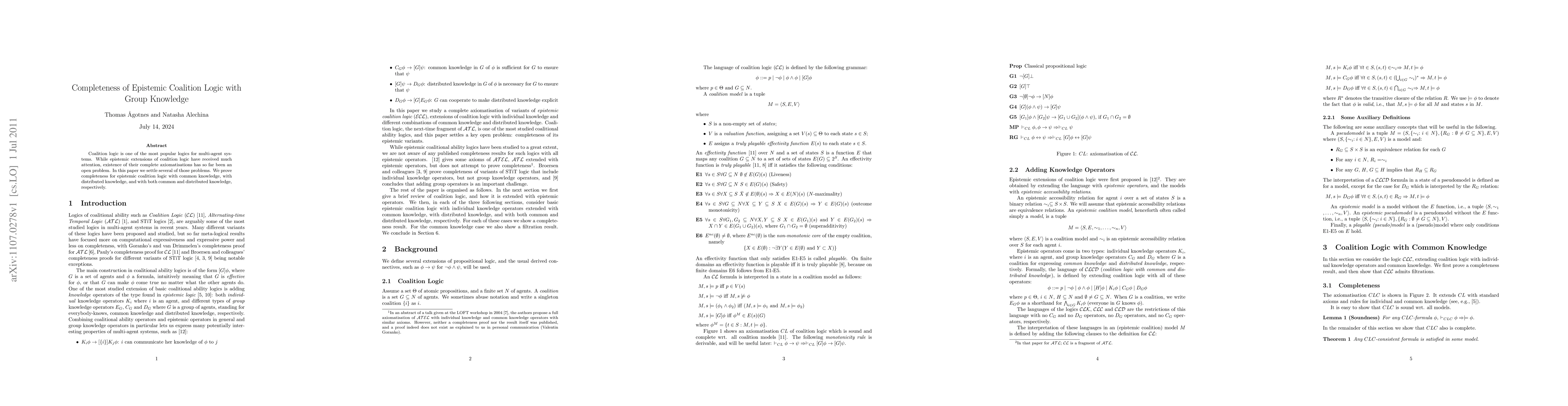 This paper addresses the completeness of various epistemic extensions of coalition logic, proving complete axiomatizations for coalition logic with common knowledge, distributed knowledge, and a combination of both. This resolves an open problem in the field of multi-agent systems.