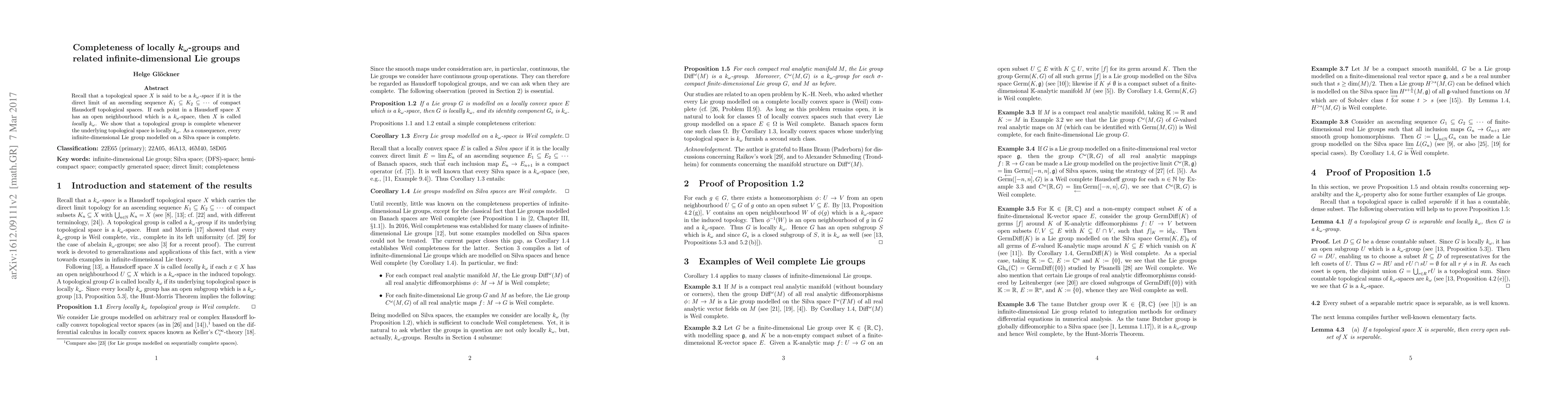 Recall that a topological space is said to be a $k_\omega$-space if it is the direct limit of an ascending sequence of compact Hausdorff topological spaces. If each point in a Hausdorff space $X$ has an open neighbourhood which is a $k_\omega$-space, then $X$ is called locally $k_\omega$. We show that a topological group is complete whenever the underlying topological space is locally $k_\omega$. As a consequence, every infinite-dimensional Lie group modelled on a Silva space is complete.